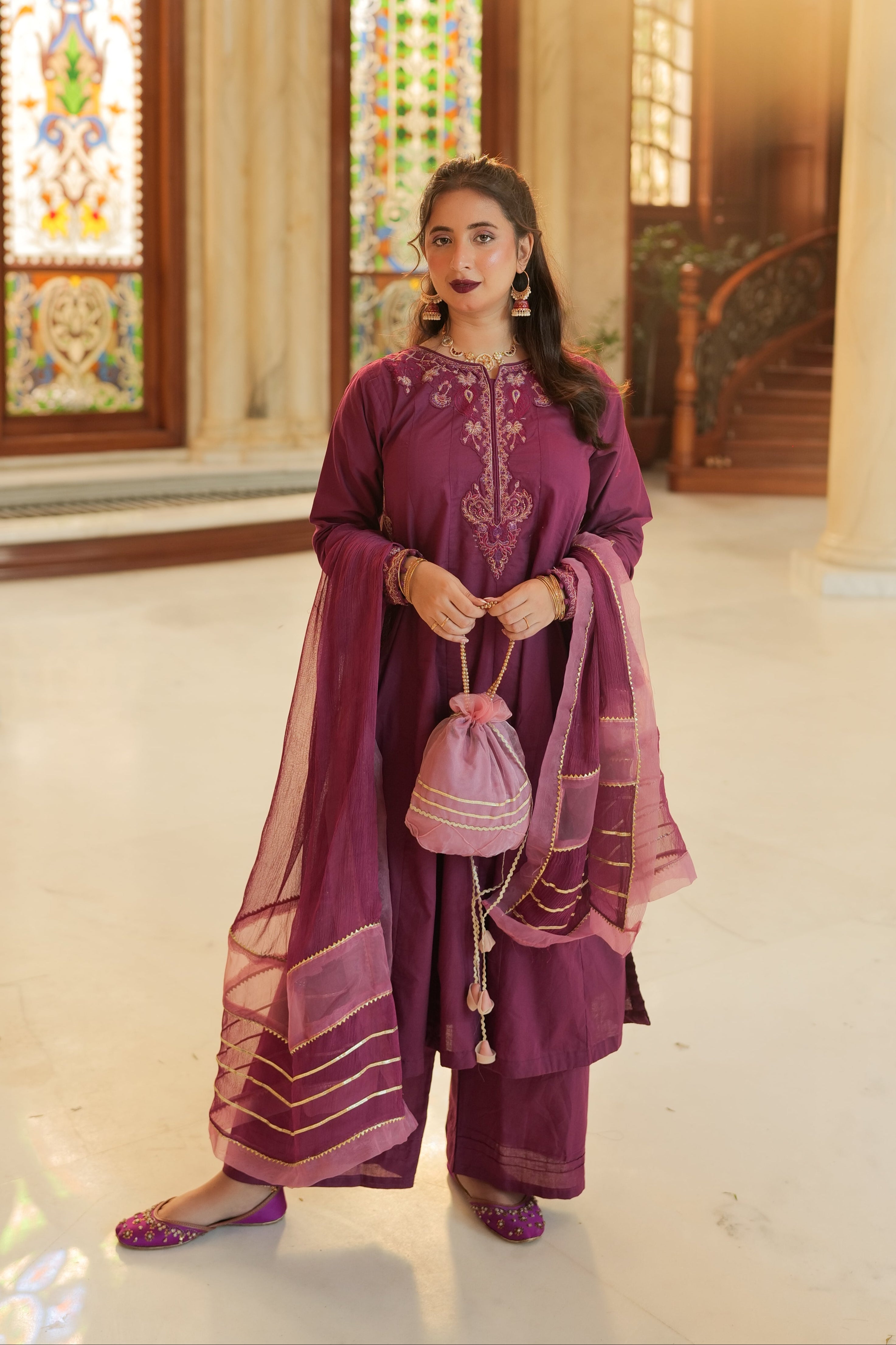 This stunning outfit features a magenta kalidar long shirt with side panels attached, showcasing intricate embroidery on the neckline and sleeves. The shirt is adorned with pearl button details on the side panels and sleeves, adding a touch of elegance to the overall design.