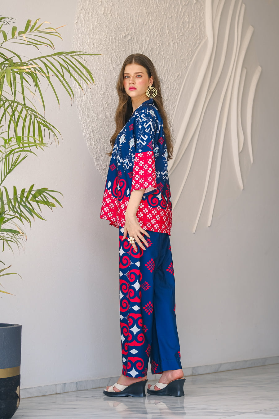 Introducing our ?Sapphire? summer outfit, crafted from luxurious crepe material in a striking dark blue and red color combination. This elegant two-piece set features a stylish short-sleeve shirt and matching trousers, adorned with a vibrant floral print that captures the essence of summer. The lightweight, breathable crepe fabric drapes beautifully, ensuring all-day comfort and a flattering fit. Perfect for everything from casual beach outings to chic evening events, the ?Sapphire? ensemble effortlessly blends sophistication with playful flair. Embrace the season in style with this eye-catching, versatile outfit that brings a touch of summer elegance to any occasion.