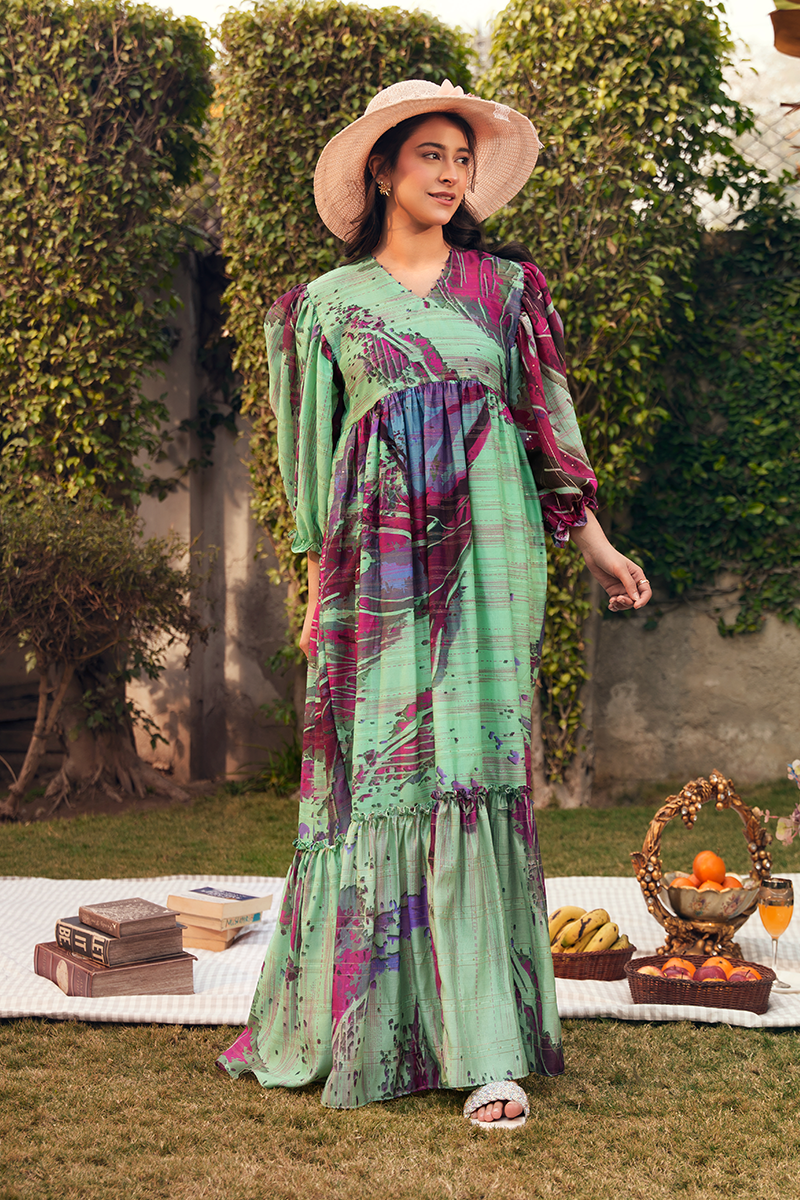 Featuring a soft baby sea blue color, accented with beautiful pink and blue patterns. The fabric, made from comfortable viscose, gives it a light, flowy feel. Its neck style adds a chic touch to the fresh, vibrant look.
