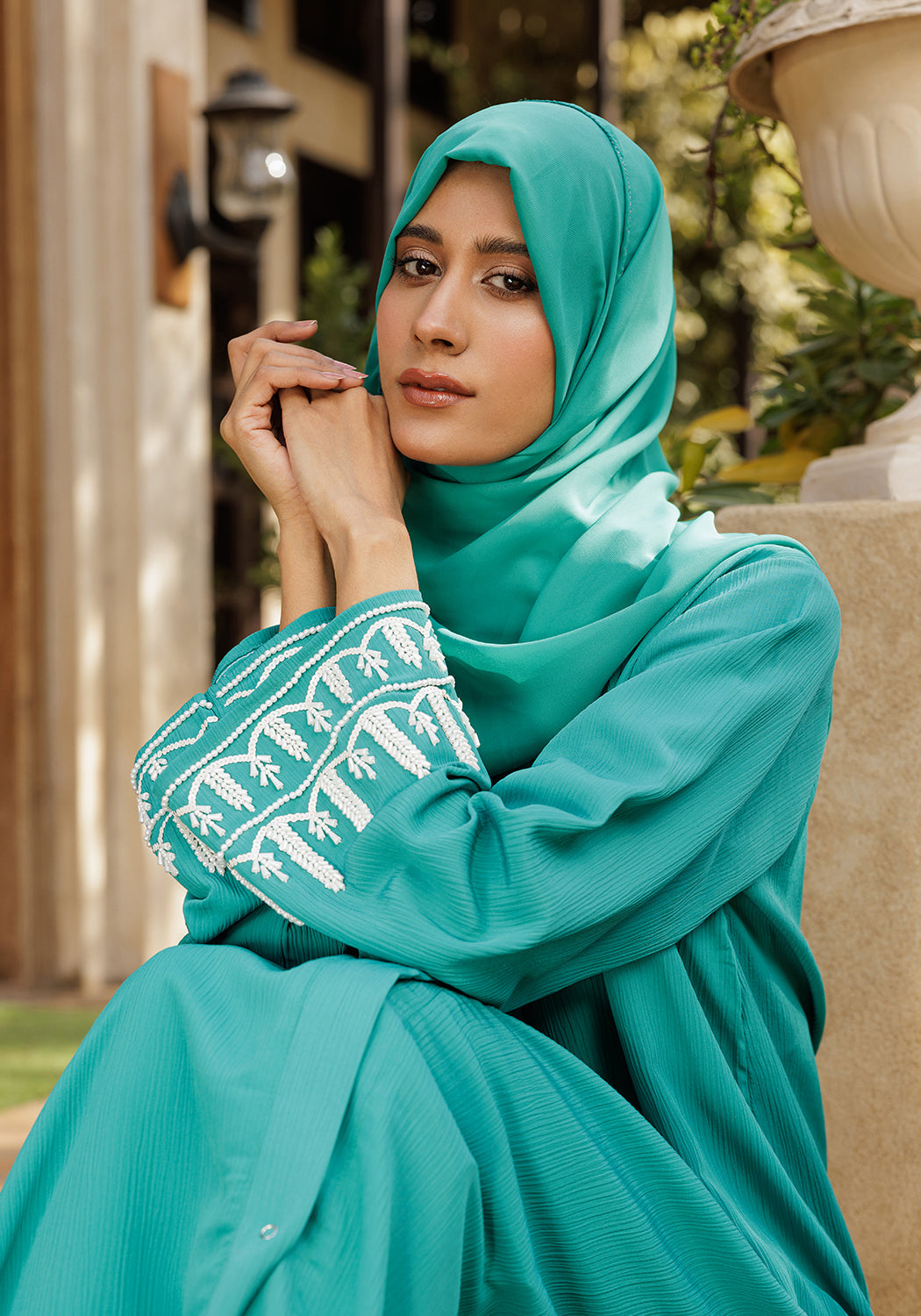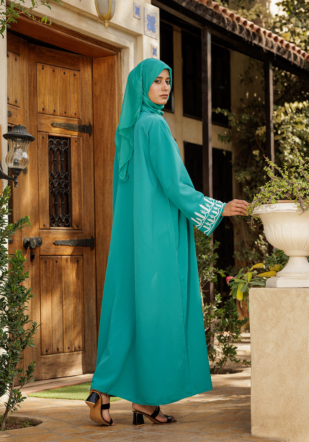 Step into timeless elegance with our Sea Green Embroidered Sleeve Abaya. Made from a soft, flowy fabric, this piece is both comfortable and stylish. The highlight of this design is the intricate white embroidery on the sleeves, adding a touch of sophistication to its modest silhouette.