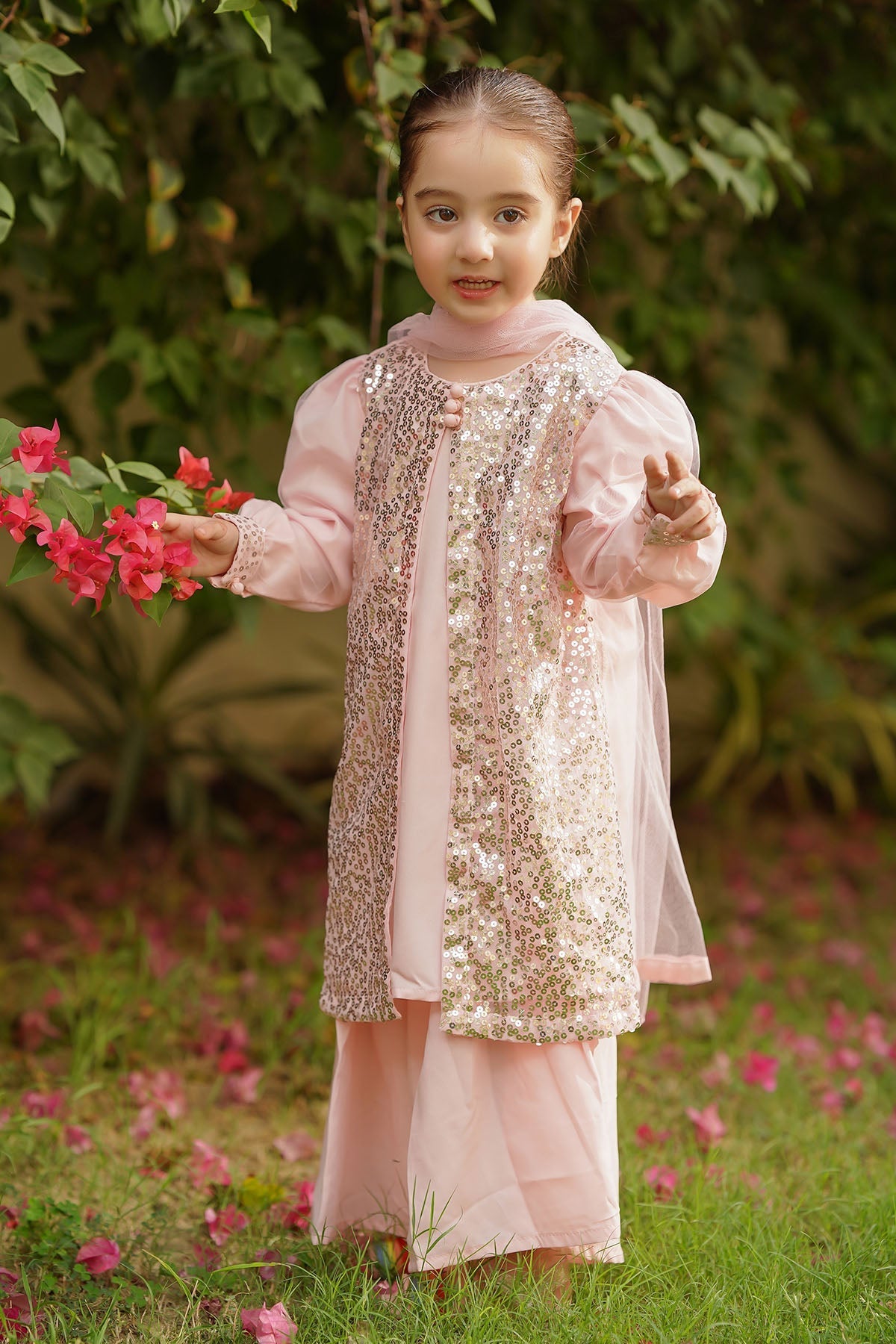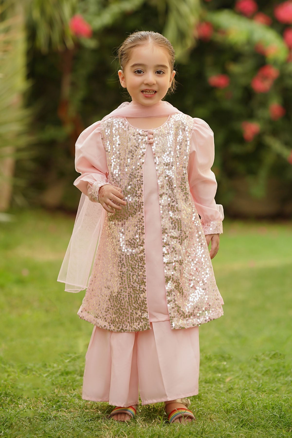 Top: Light Pink Sequence Net Coat Style Top with Malai Crepe InnerBottom: Light Pink Malai Crepe Gharara PantsDupatta: Light Pink Soft Net Dupatta