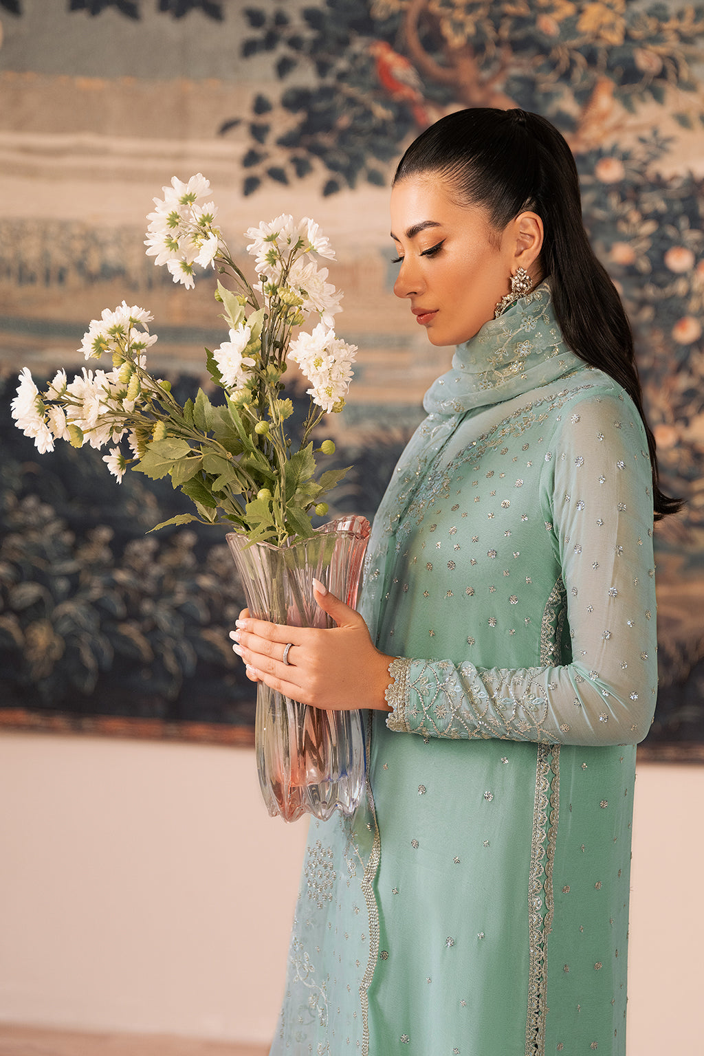 This exquisite organza shirt features delicate embroidery work, highlighted by intricate tilla and sequin details. The design is further elevated with laser-cut work along the daman borders, adding a touch of sophistication. The ensemble is paired with a plain raw silk trouser and complemented by an organza dupatta, which is adorned with finely embroidered pallus and borders, creating a harmonious blend of elegance and tradition.