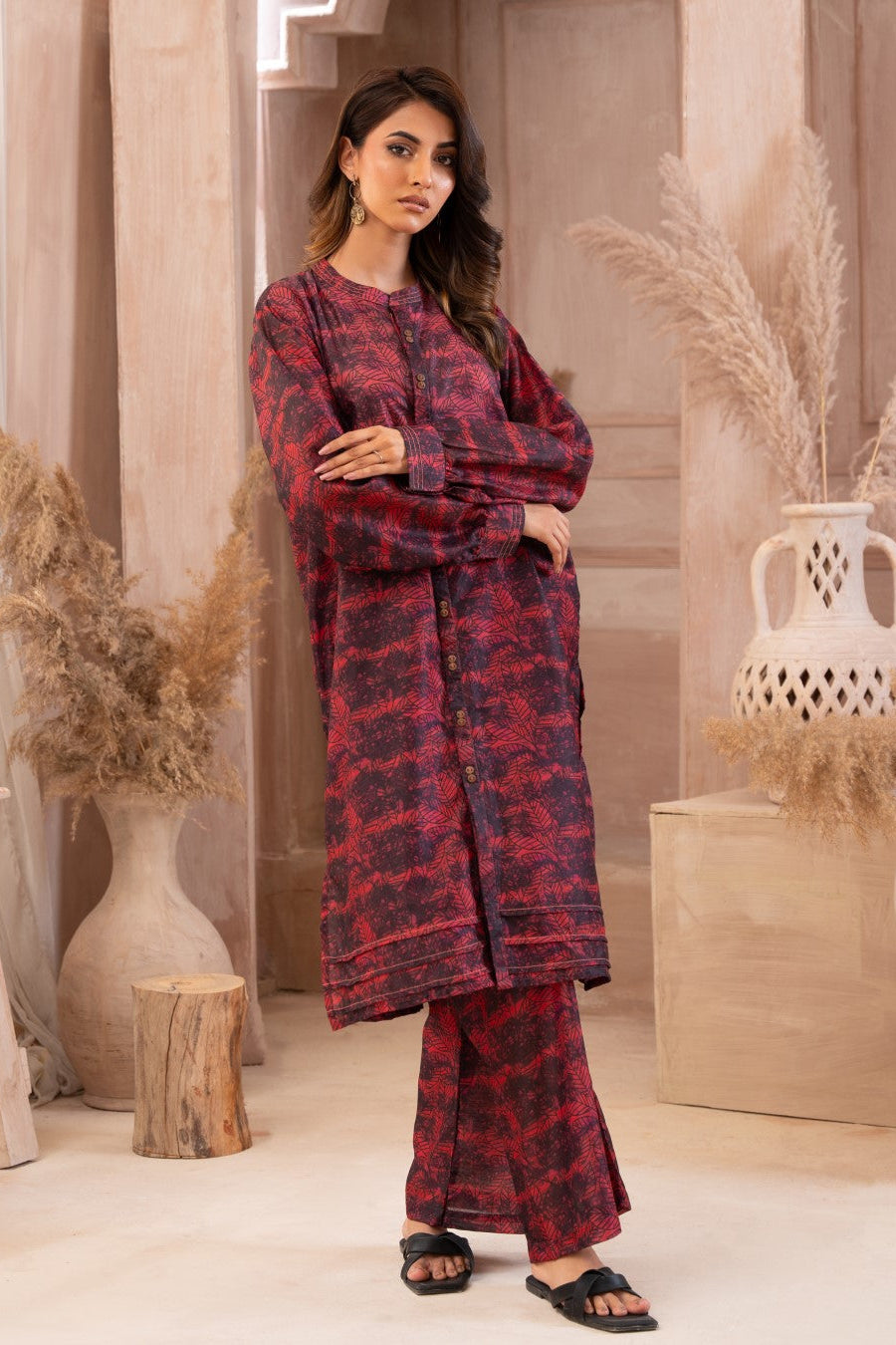 Shadow of red leaves article is a digitally printed 2Pc. Printed shirt with stylish neckline and gathered sleeves with a pleated hem. Paired With Straight Pants.