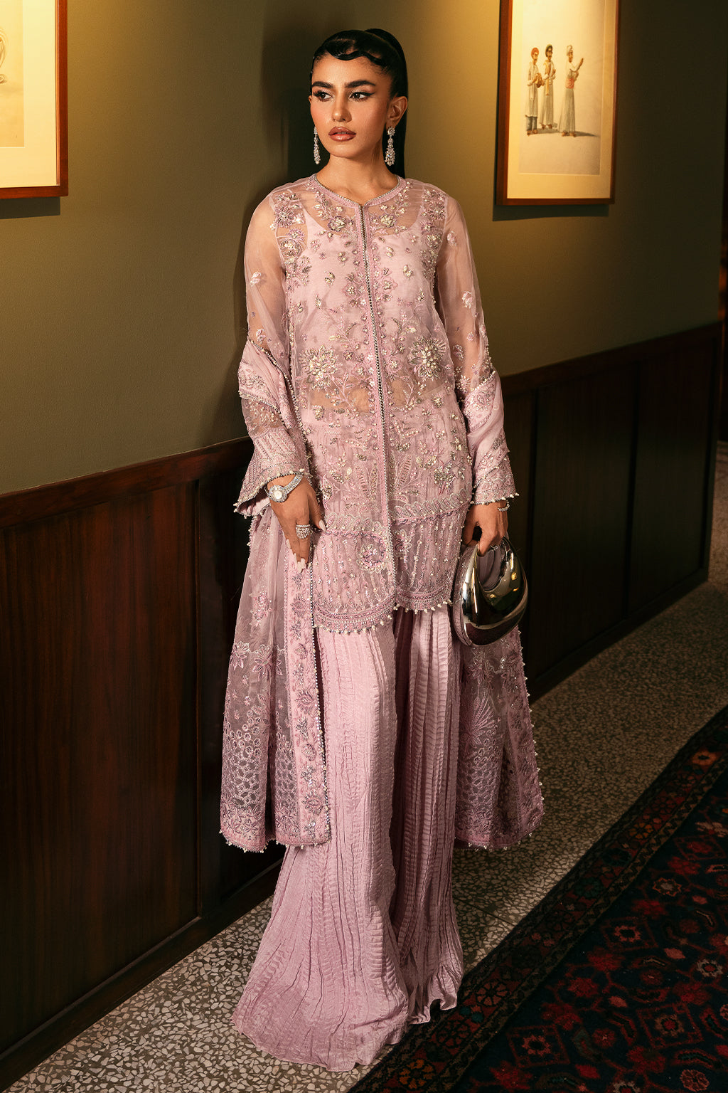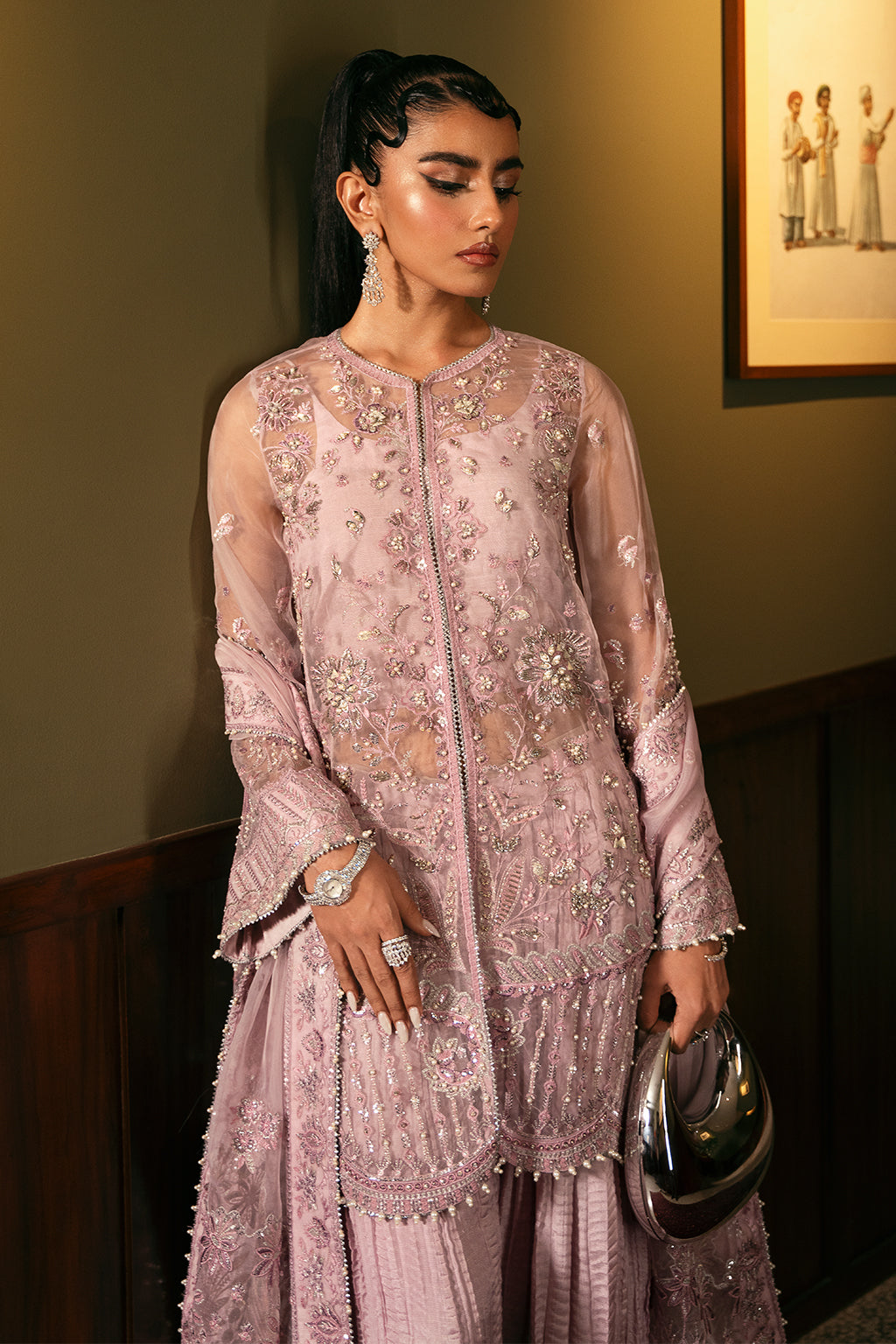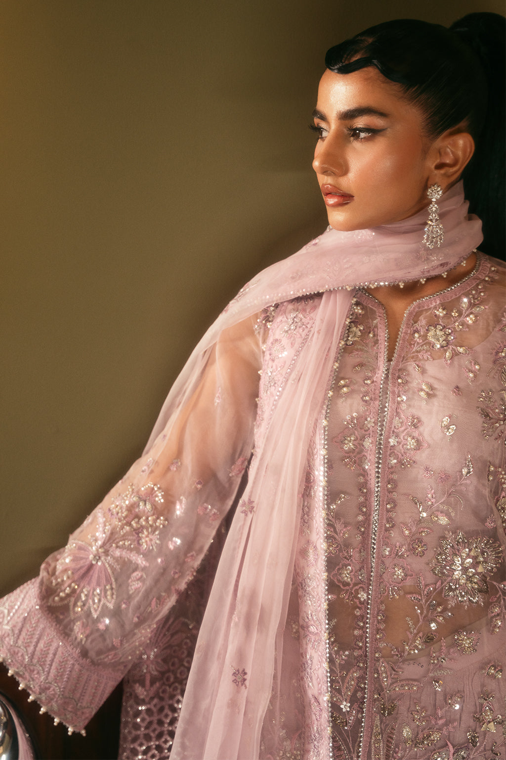 This exquisite dusky lilac short shirt is crafted from luxurious organza, featuring intricate multi-sequin embroidery and delicate hand embellishments on the front and sleeves, adding a touch of elegance and shimmer. Paired with a heavily embroidered organza dupatta, the ensemble exudes sophistication and grace. The raw silk crush bottoms create a voluminous and regal silhouette, ensuring a flattering drape, while the soft lining provides comfort and ease of wear. Perfect for festive occasions, weddings, and formal gatherings, this ensemble blends traditional craftsmanship with contemporary charm, making it a timeless addition to any wardrobe.