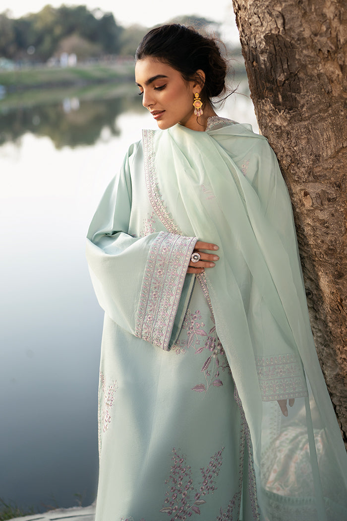 Mint green lawn shirt featuring a delicate embroidered front and embroidered sleeve borders, offering a fresh and elegant appeal.