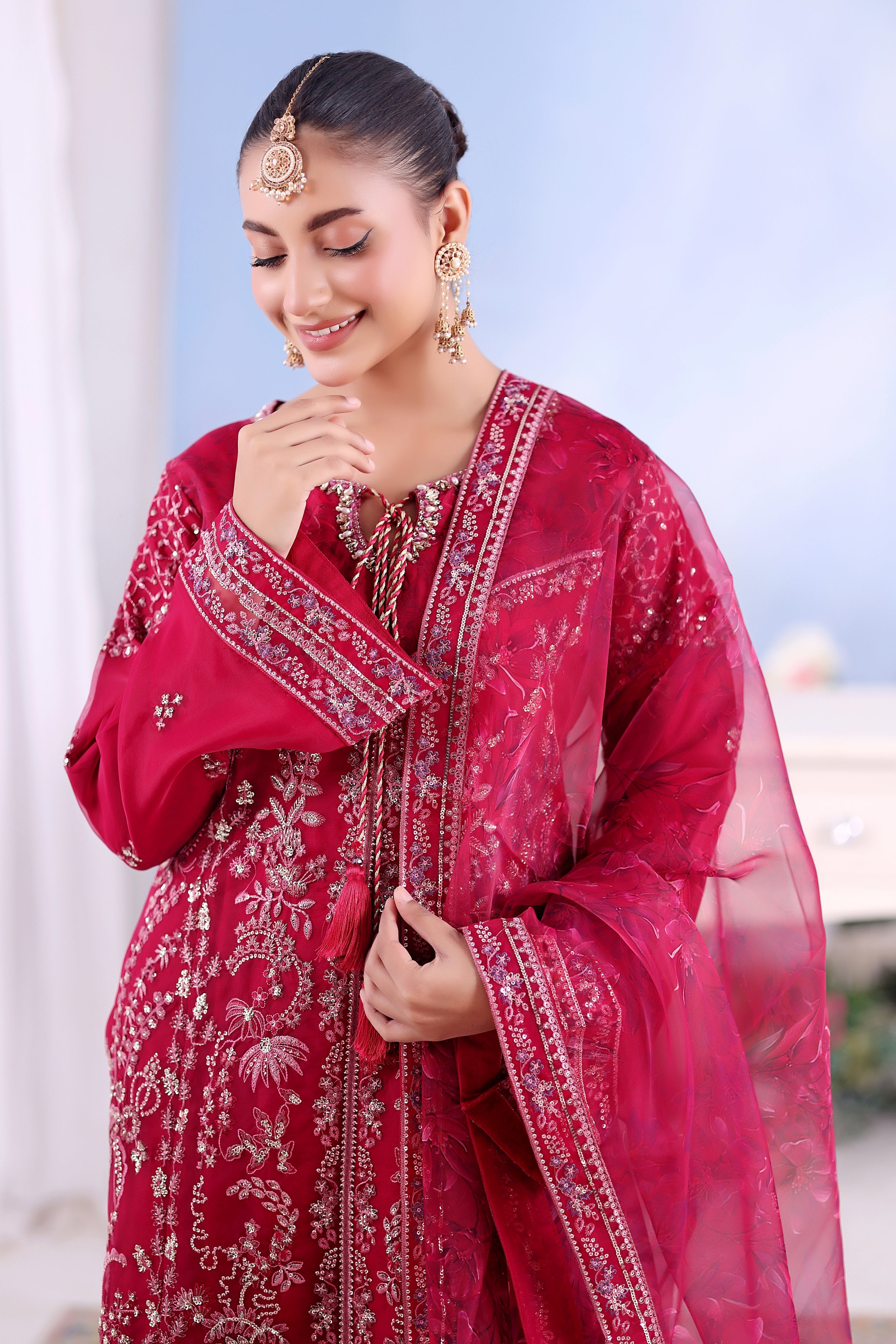 Each outfit includes an unstitched luxury embroidered organza shirt adorned with hand embellishments, a ready-to-wear embroidered organza dupatta that drapes effortlessly, and a plain dyed grip trouser to complete the refined look.