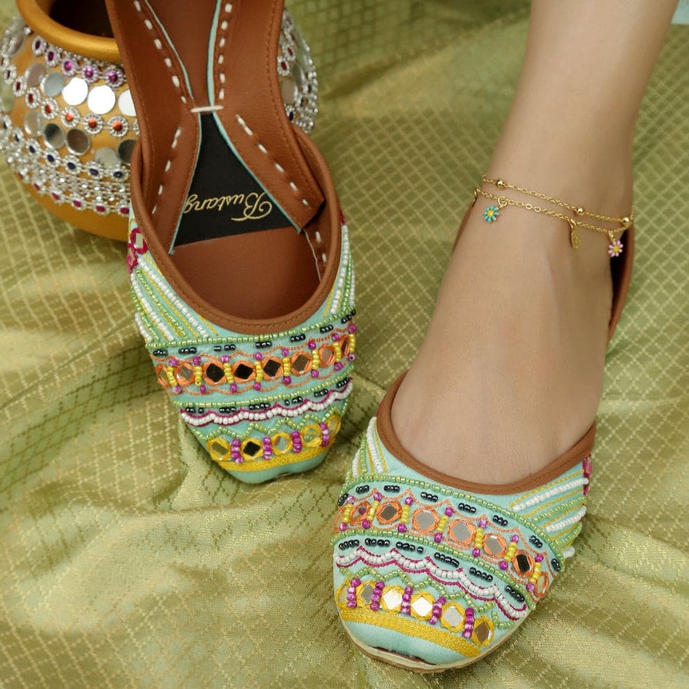 This embroidery khussa is made of leather sole and provides excellent traction and support. Beautiful handcrafted embroidery is done over the upper part on a soft and breathable material. The slip-on khussa shoes design makes them easy to put on and take off, and the padded insole provides extra cushioning for your feet.