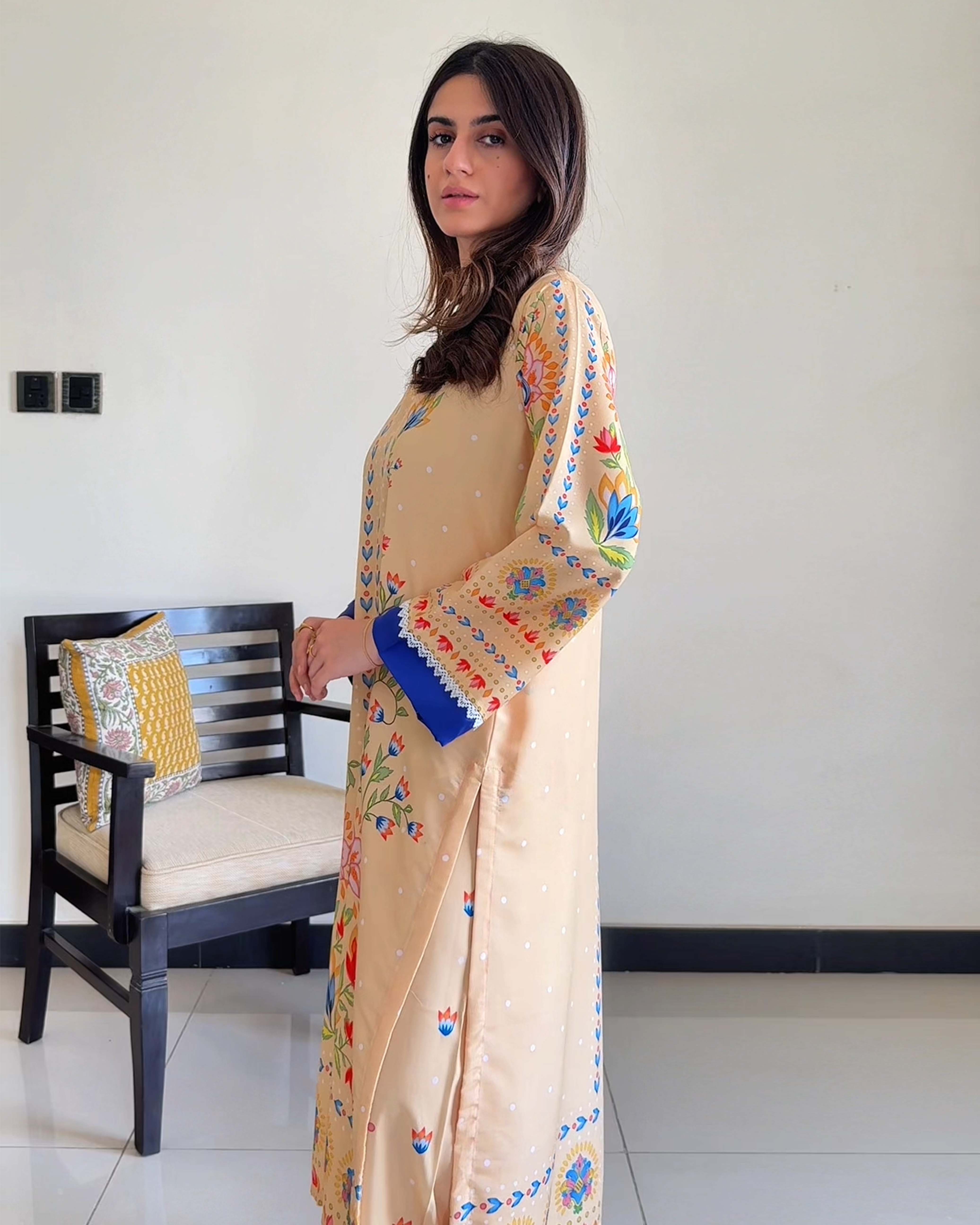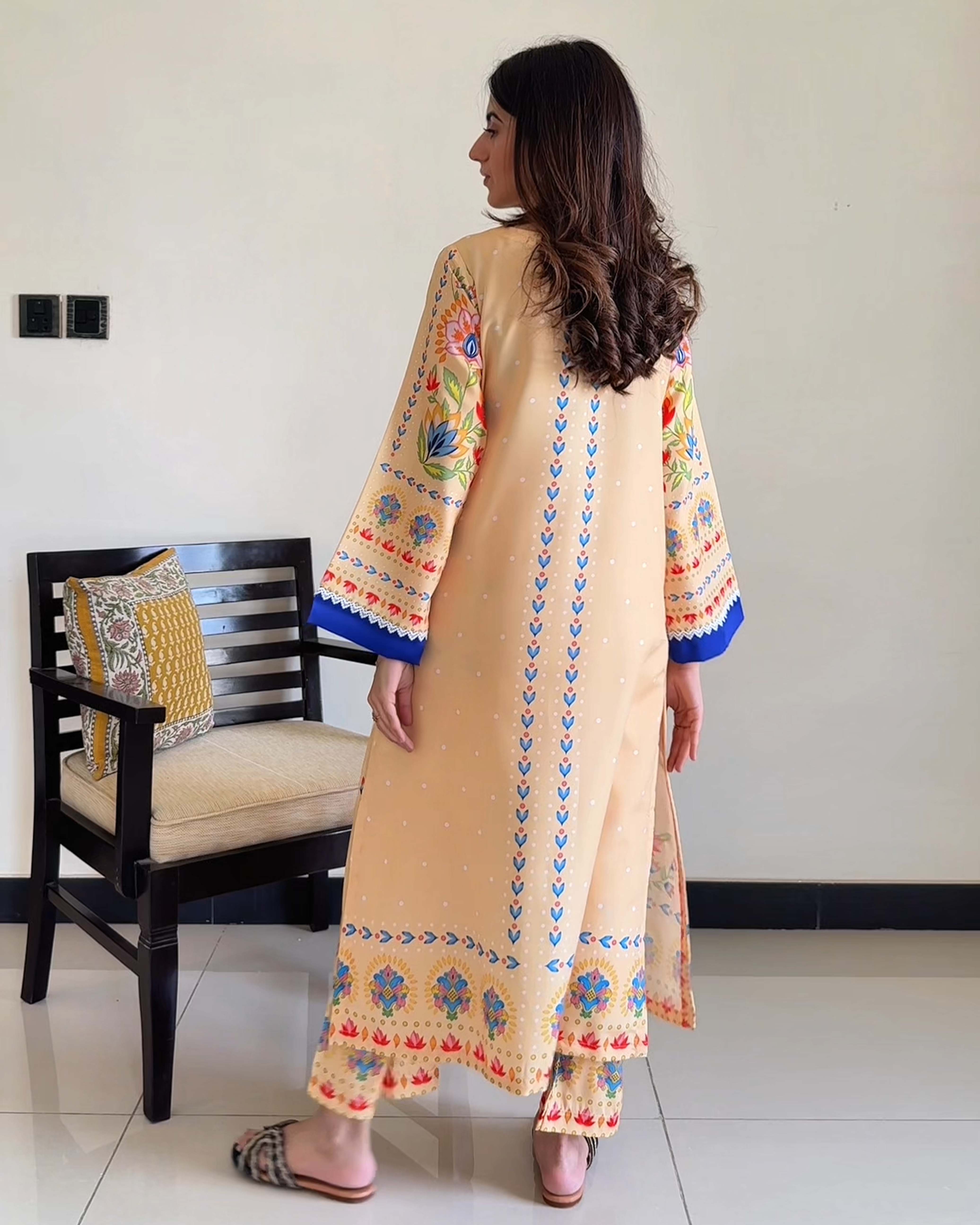 Crafted from breathable Arabic lawn, this outfit features a beautifully detailed digital print that blends tradition with a modern aesthetic.