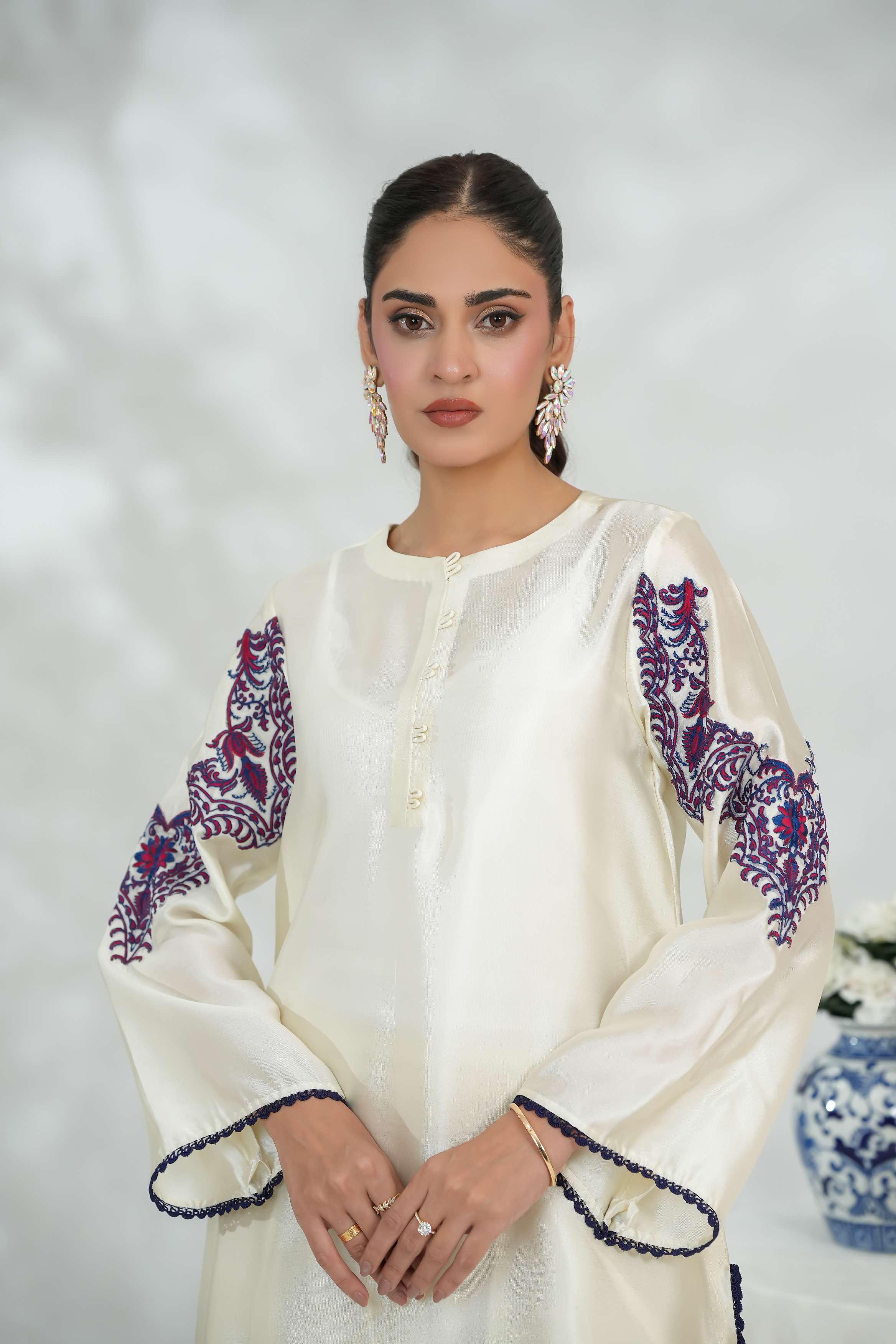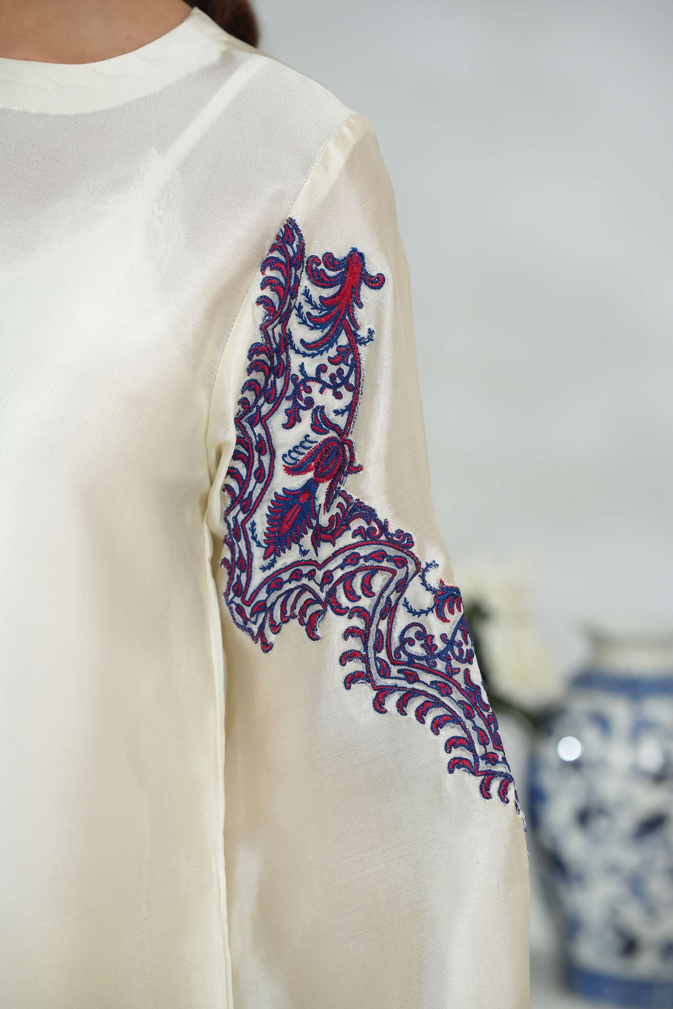 Grace in Ivory — A pristine ivory silk ensemble adorned with intricate maroon and cobalt blue embroidery on the sleeves and back, reflecting refined artistry and modern poise. The fluid silhouette and subtle sheen of the fabric create a luxurious festive look, perfect for soirées and winter celebrations.
