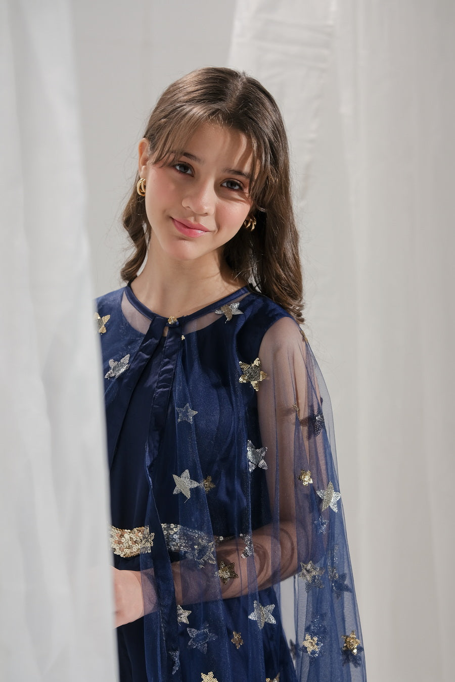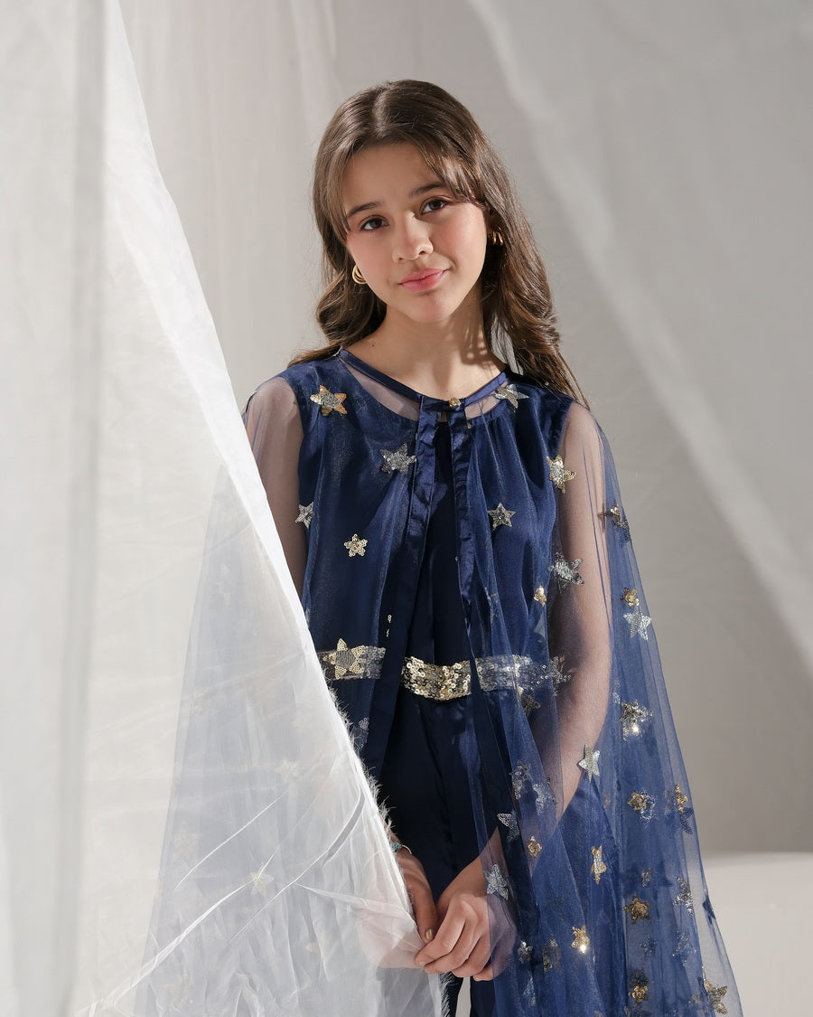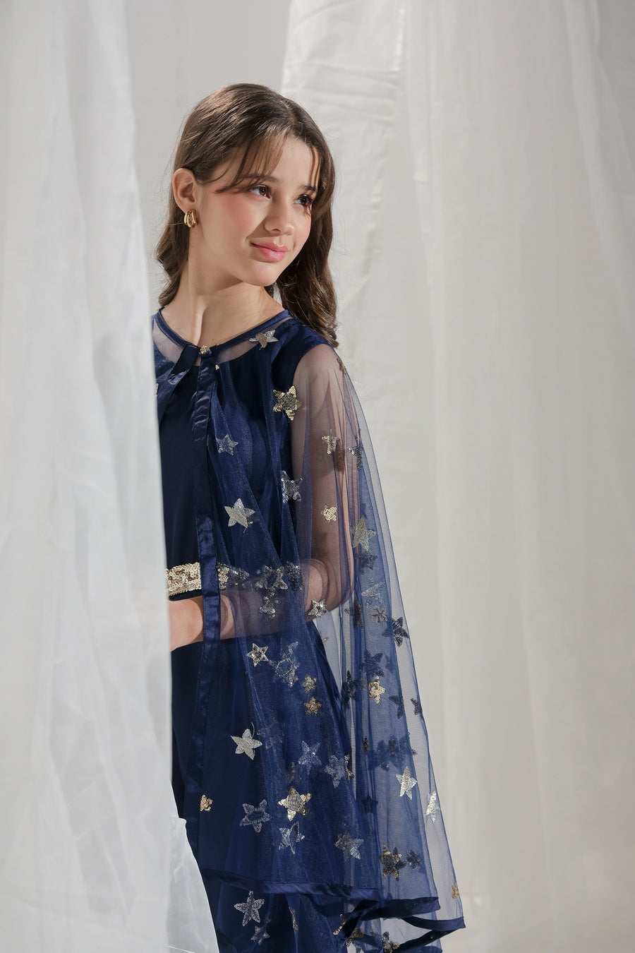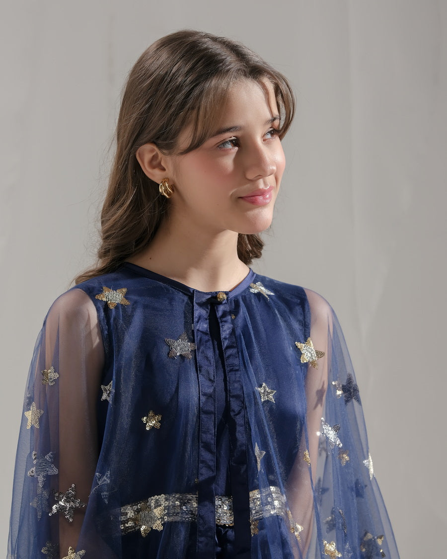Drape your little star in elegance with the Sitara outfit, a perfect blend of grace and charm. This enchanting ensemble features a flowy navy blue silhouette adorned with delicate golden and silver star embellishments, creating a celestial look that shines with every movement. The sheer overlay adds a touch of ethereal beauty, while the comfortable satin trousers ensure ease of wear for any occasion. Whether it?s a festive gathering or a special evening event, Sitara is designed to make your little one sparkle like the star she is.