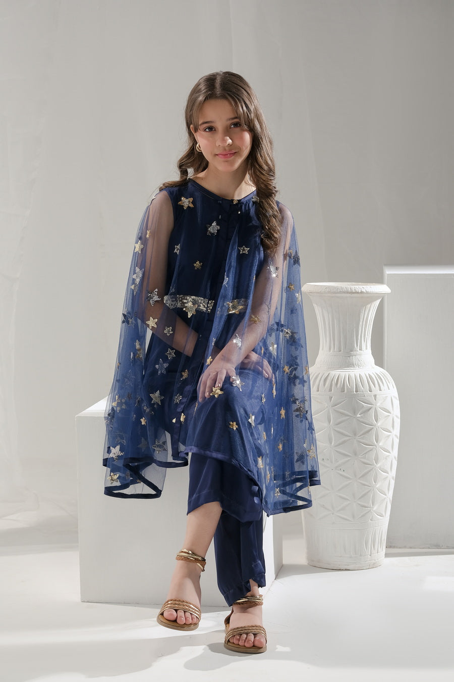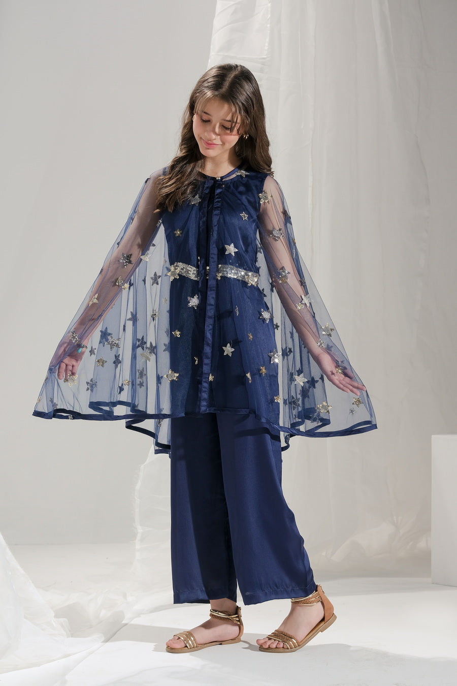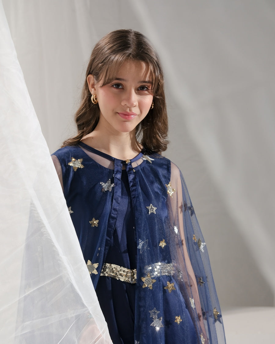 Drape your little star in elegance with the Sitara outfit, a perfect blend of grace and charm. This enchanting ensemble features a flowy navy blue silhouette adorned with delicate golden and silver star embellishments, creating a celestial look that shines with every movement. The sheer overlay adds a touch of ethereal beauty, while the comfortable satin trousers ensure ease of wear for any occasion. Whether it?s a festive gathering or a special evening event, Sitara is designed to make your little one sparkle like the star she is.