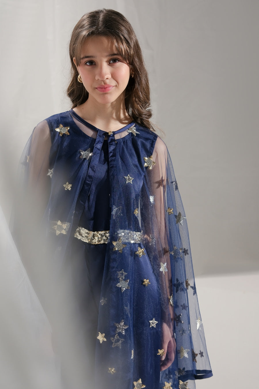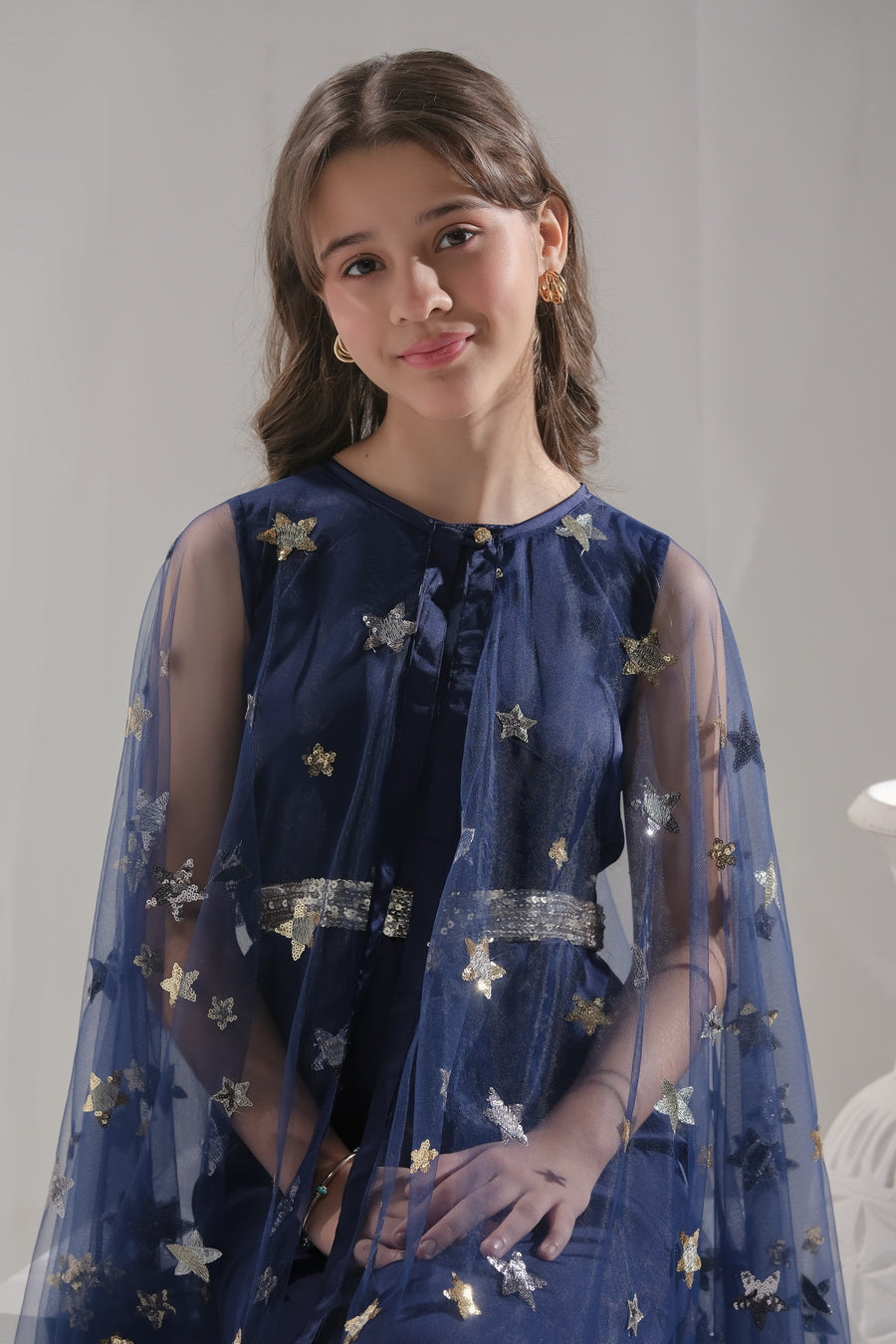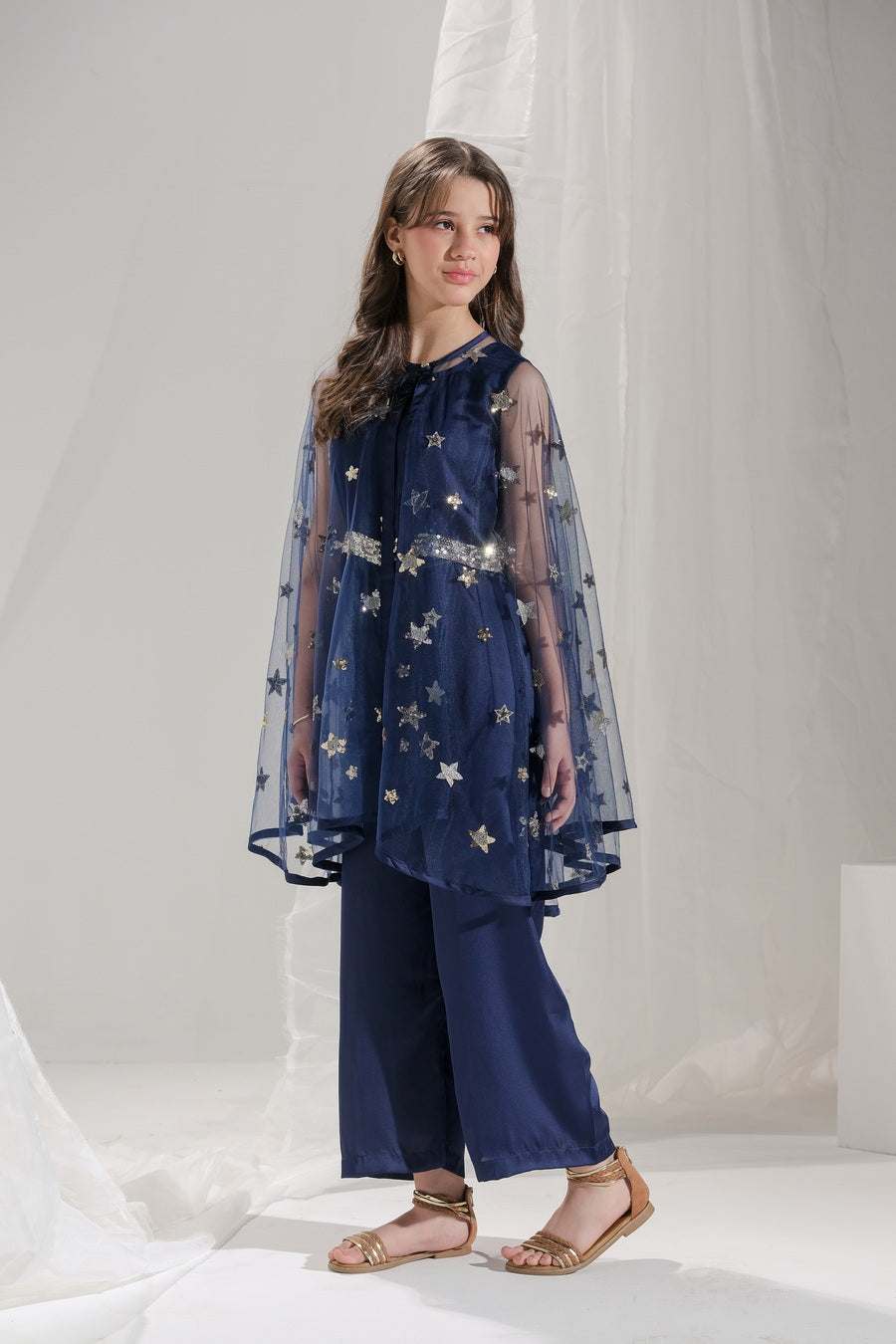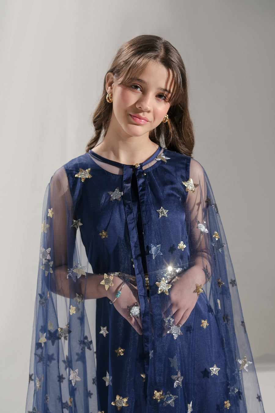 Drape your little star in elegance with the Sitara outfit, a perfect blend of grace and charm. This enchanting ensemble features a flowy navy blue silhouette adorned with delicate golden and silver star embellishments, creating a celestial look that shines with every movement. The sheer overlay adds a touch of ethereal beauty, while the comfortable satin trousers ensure ease of wear for any occasion. Whether it?s a festive gathering or a special evening event, Sitara is designed to make your little one sparkle like the star she is.