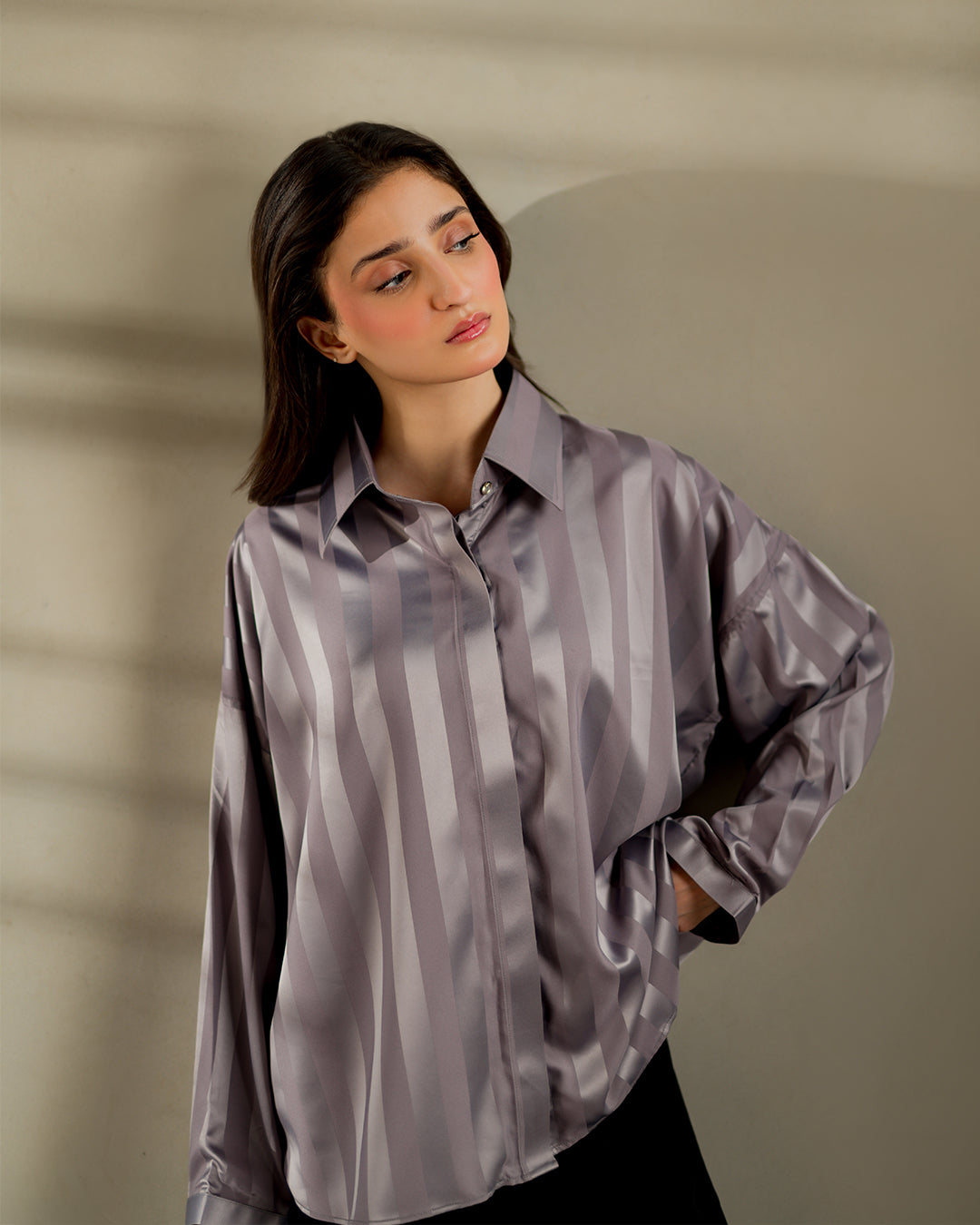 Elevate your everyday style with the Slate Stripes shirt, designed in a lustrous striped fabric that adds subtle sophistication. Its oversized silhouette with drop shoulders and full sleeves creates a relaxed yet polished look, perfect for day-to-night dressing. Whether styled with tailored trousers or casual denim, this shirt makes an effortless statement.
