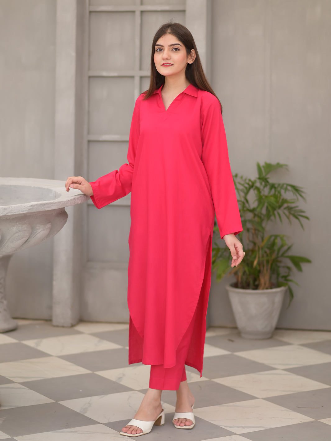 A very Beautiful Hot Pink Co-Ord Set includes a Shirt & Straight Paint With 2 Side Pockets. Designed Peshawari Collar and Simply Elegant Sleeves In Smooth & Soft Wash and Wear Fabric with alluring Fall Which is Very Easy to Iron.