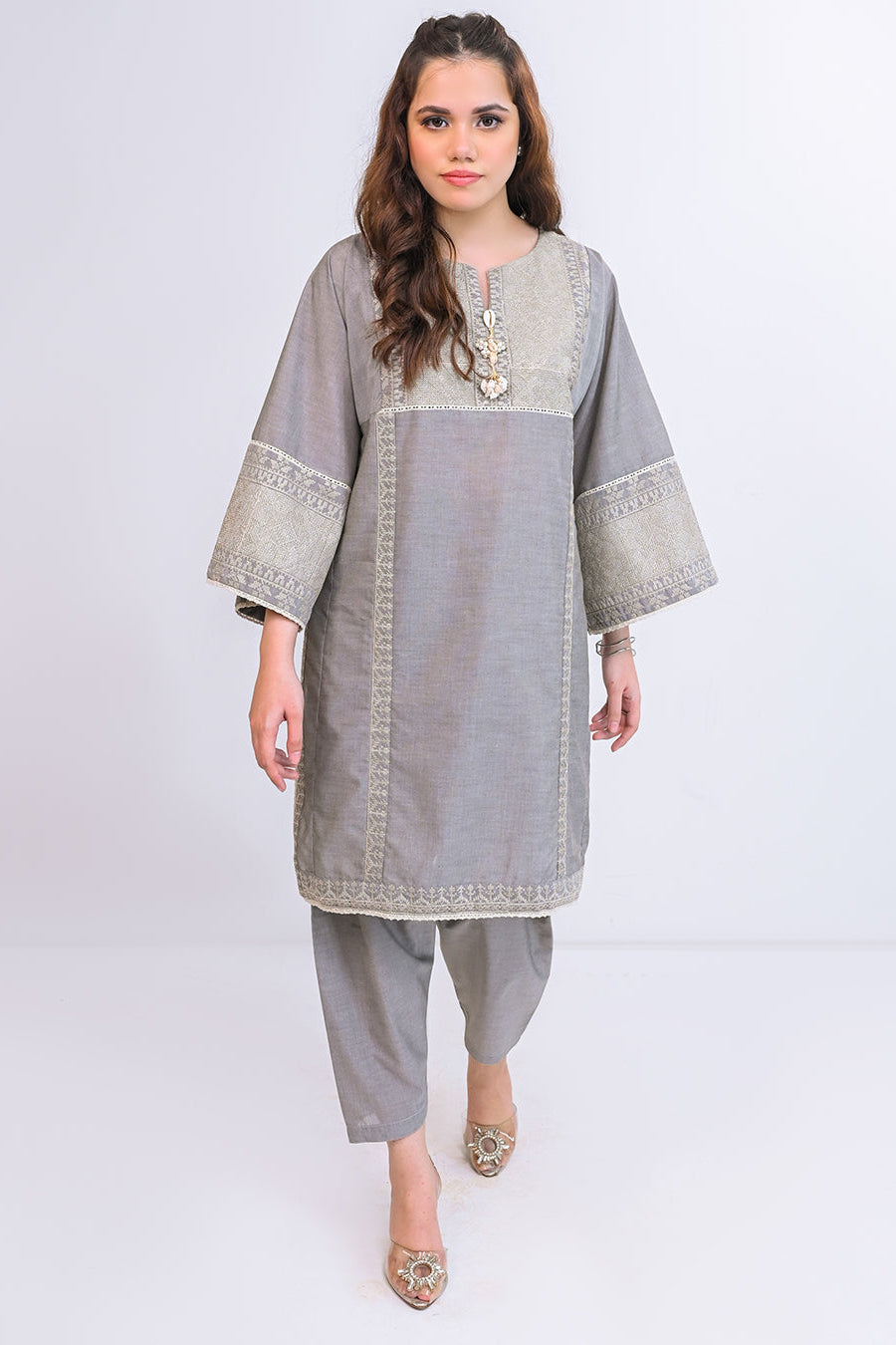 This modern and aesthetic kurta with shalwar blends contemporary and traditional styles, featuring classic grey and off-white cross stitch embroidery, with pearl accents for a refined finish.