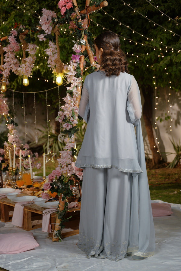 A celestial 3-piece set crafted in soft grey hues, this outfit features a sleeveless peplum shirt with a flared silhouette, paired with wide-legged palazzo pants for effortless elegance. The ensemble is adorned with intricate gold embroidery along the hems, adding a regal touch. A sheer dupatta edged in matching embroidery completes the look, making it ideal for festive soirées and formal gatherings.