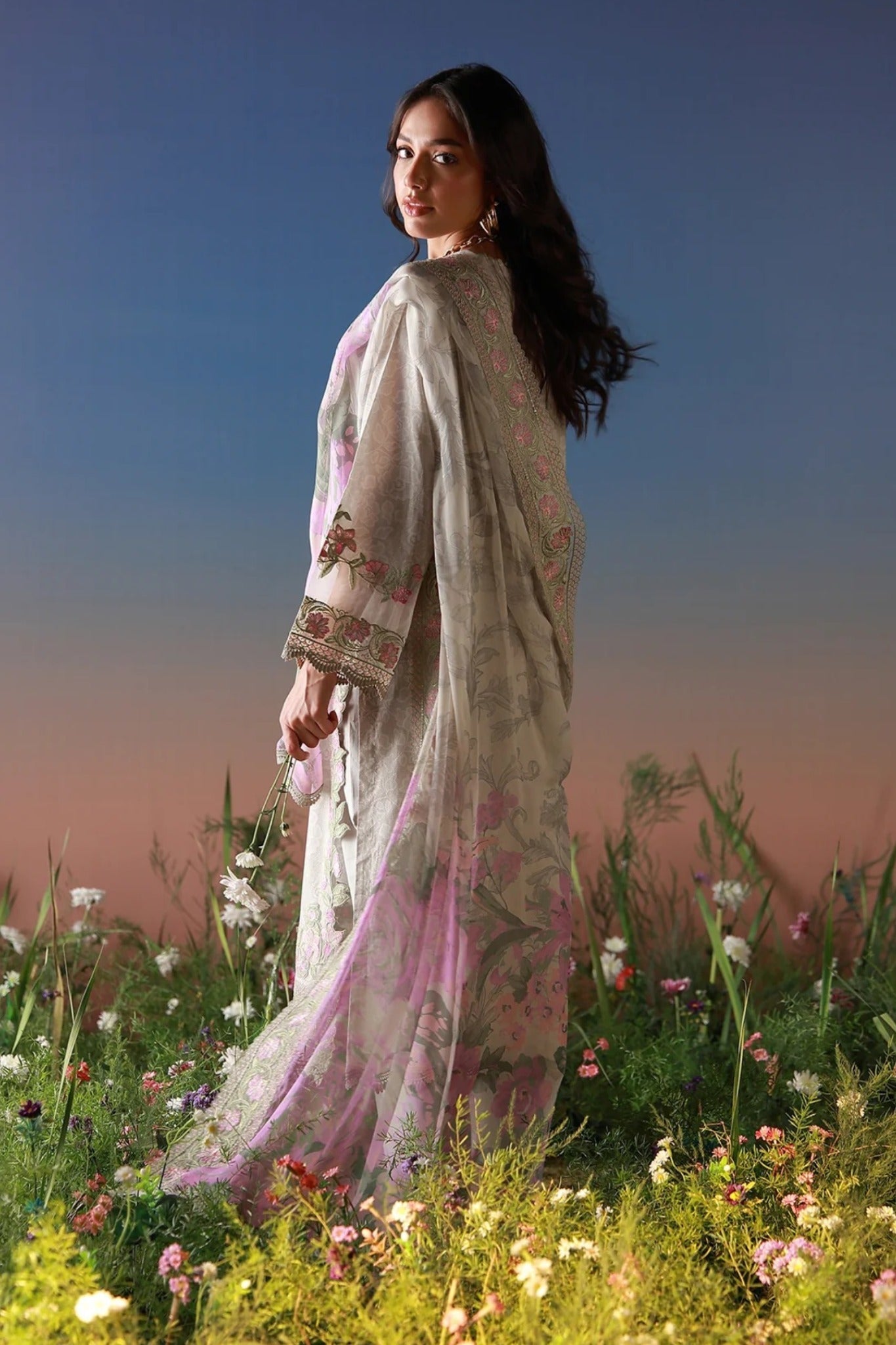 Step into understated luxury with this exquisitely embroidered ensemble, crafted in a soft neutral palette and adorned with delicate pastel French florals. The intricate neckline embroidery and wide statement sleeves add a graceful charm, while the printed and embroidered silk dupatta in contrasting magenta and green hues complete the look with timeless elegance. Perfect for daytime festivities, intimate gatherings, or festive soir?s, this ensemble blends tradition with modern sophistication.