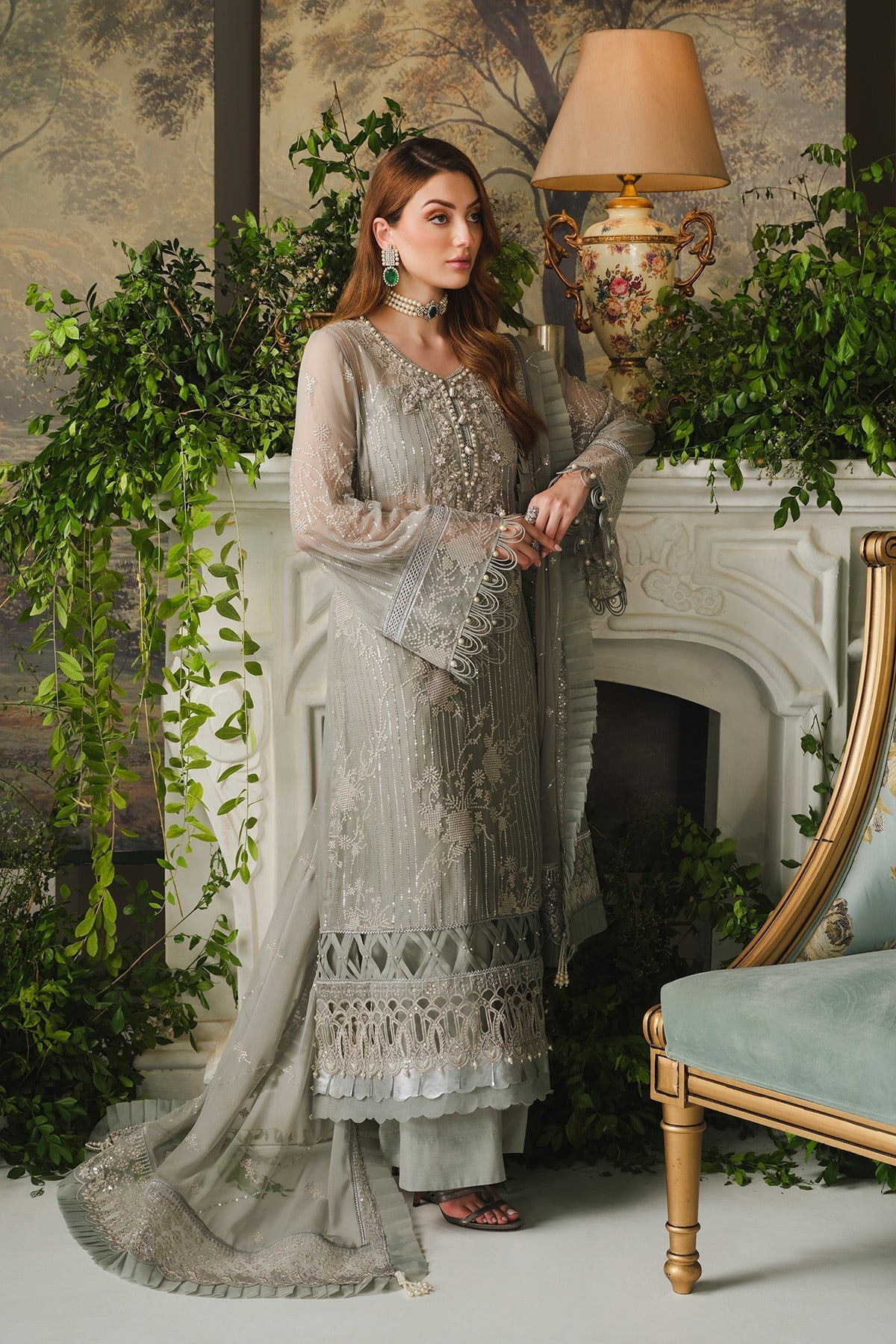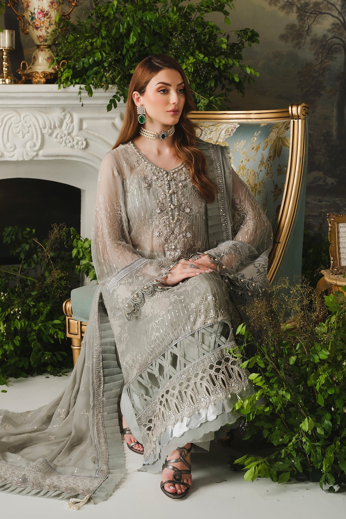 Embroidered and hand embellished neckline on organza