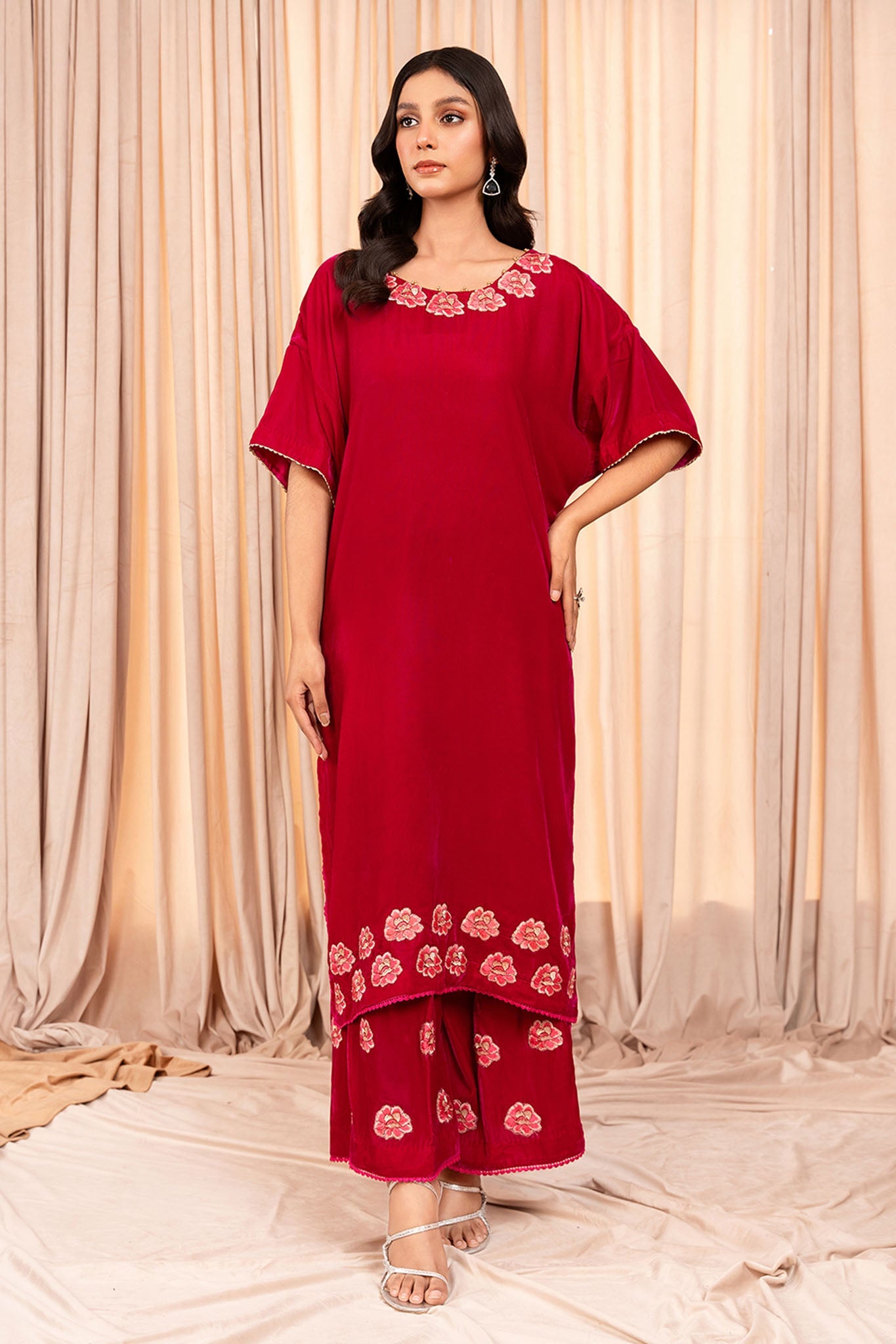 Additional Description: The dress is made from luxurious shocking pink micro 9000 velvet, At the neck, the dress features a beautifully designed floral printed patch, patch extends to the bottom of the shirt and trouser adding balance and harmony to the dress. At the cuffs/bottom/trouser, delicate lace work enhances the elegance of the dress.