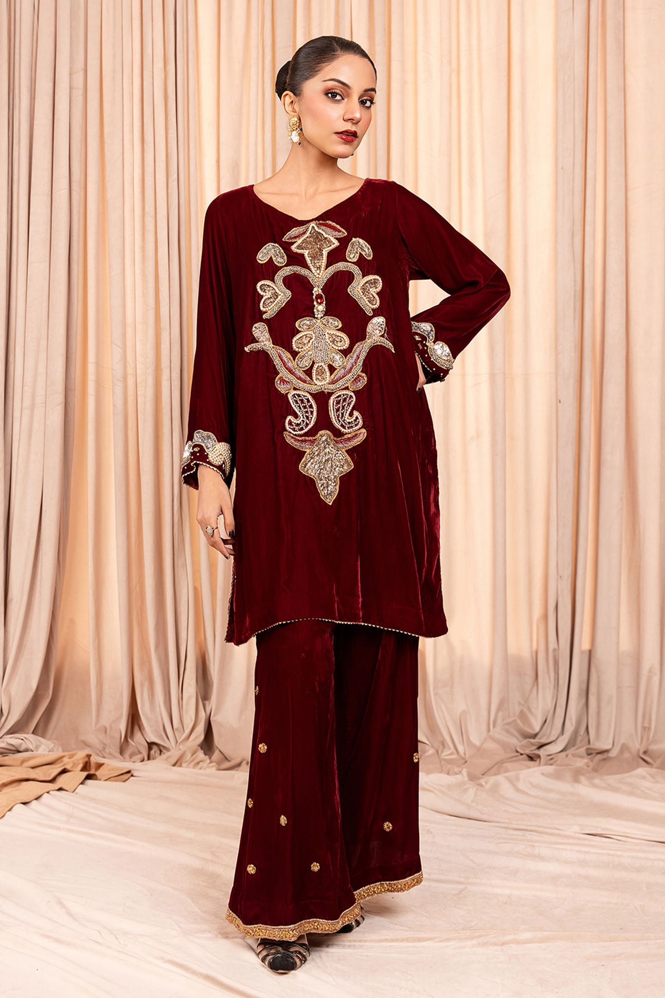 Additional Description: The dress is crafted from maroon micro 9000 velvet, a luxurious fabric with a soft, plush texture that has a rich sheen. The front and sleeves of the dress are lavishly embellished with stones and pearls, creating an eye-catching and glamorous effect. The embellishments are arranged meticulously, forming intricate patterns. The dress is paired with trousers, and the lace work at the trouser bottom adds a touch of softness and intricate detail to the lower part of the outfit. This dress would be perfect for someone looking for a striking, regal outfit with a balance of opulent embellishments and delicate details. The velvet fabric, intricate stone and pearl work, and lace accents make it a standout choice for any formal or celebratory event.
