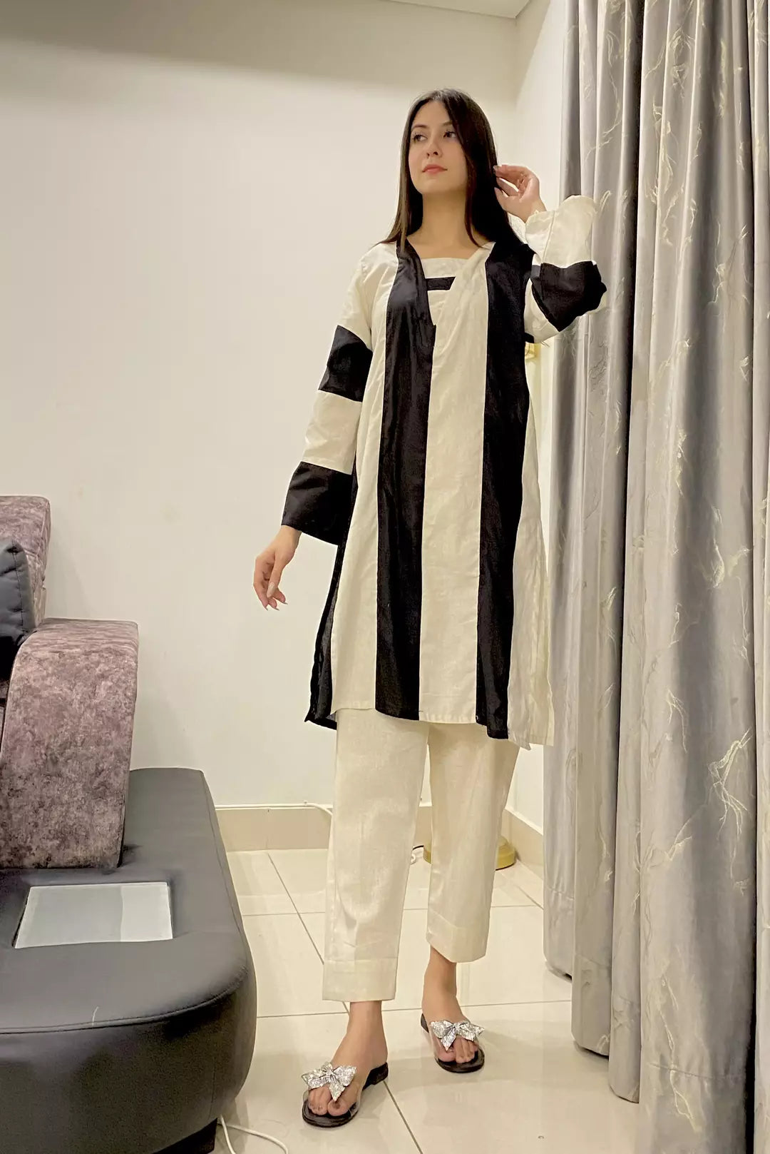 2 Piece Shirt- Solid classical Cream with Black band work for a classy impression