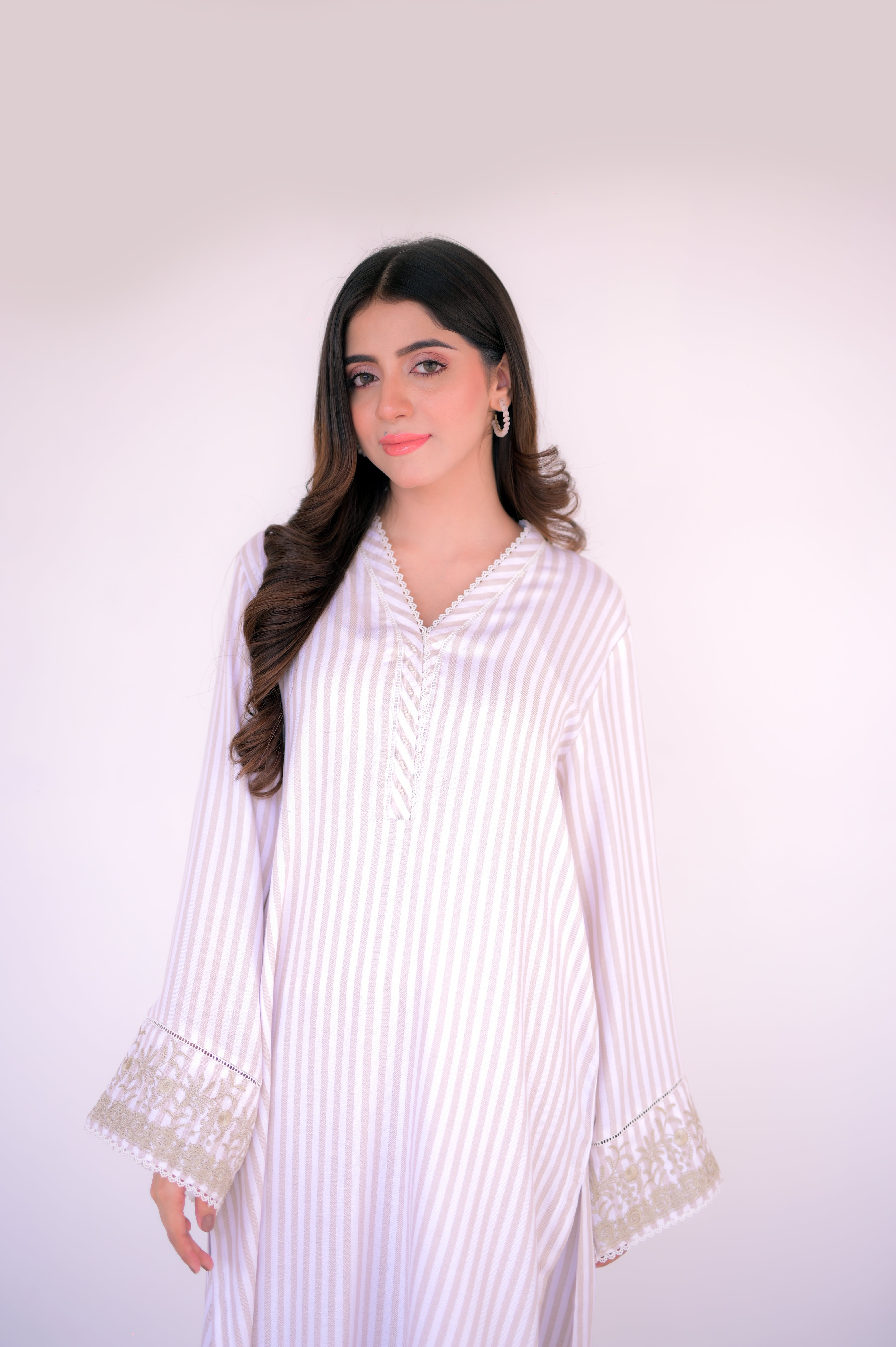 Add charm to your style with this striped 2-piece set. The soft pink and white shirt comes with delicate embroidery on the sleeves, paired with matching trousers for a graceful and comfortable look. Perfect for any casual occasion!