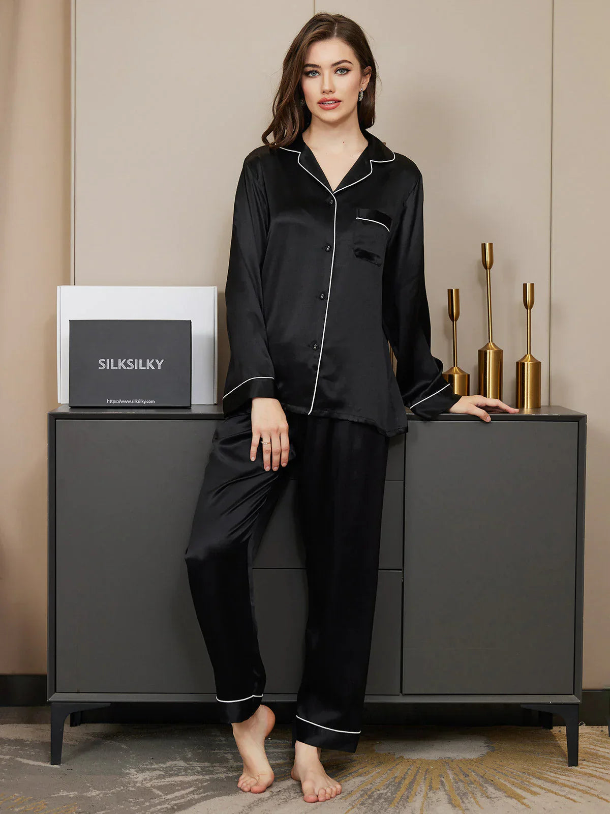Silk silky silk Black pajama set is made of silk Satin, which is known for its softness, comfort, and breathability. The flowing fit is perfect for lounging at home or sleeping
