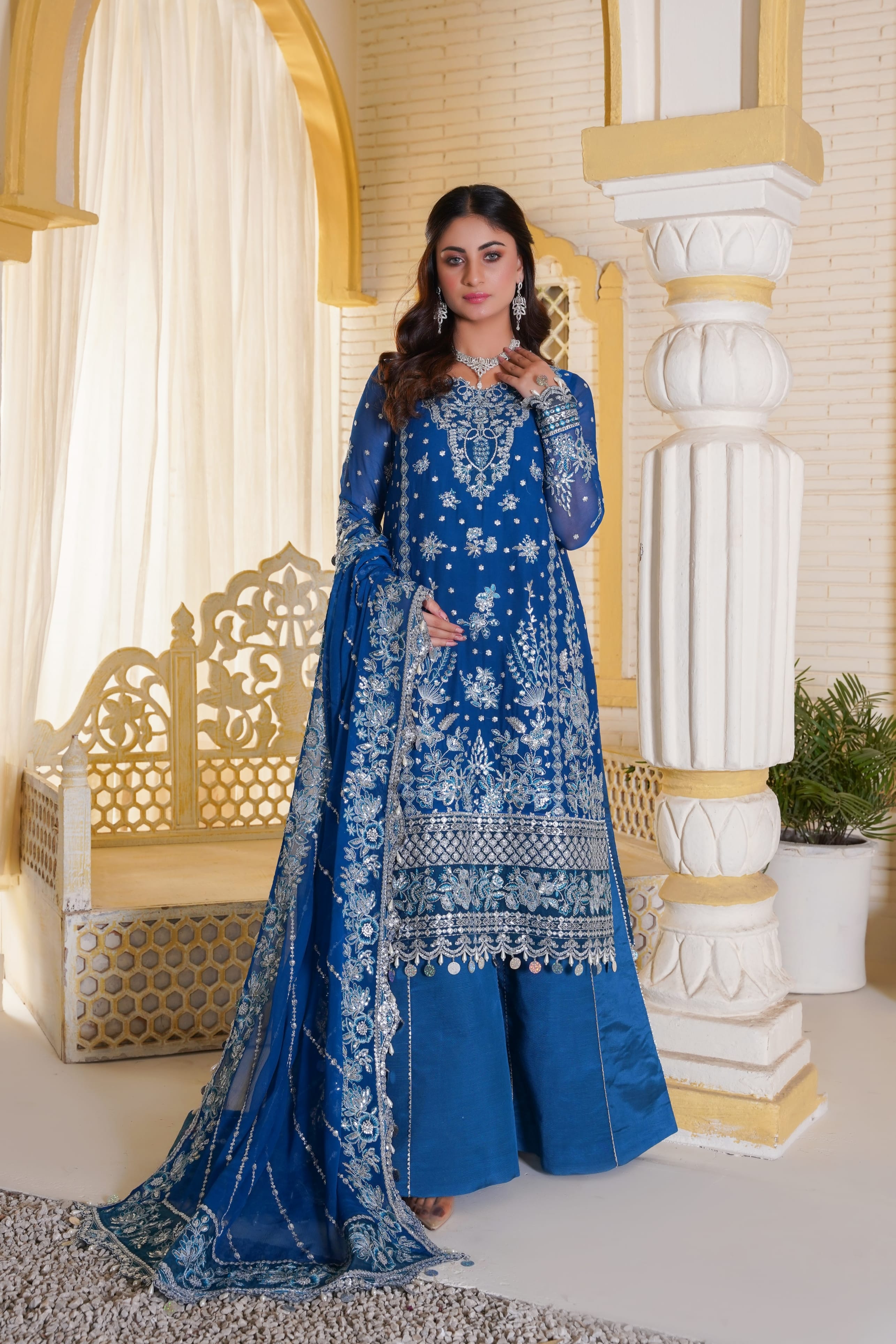 This stunning 3-piece unstitched chiffon suit features three intricately embroidered panels—center, right, and left—adorned with beautiful silver tila, sequins, and teal blue threadwork. The ensemble includes a heavily embroidered dupatta with a foursided ornate border, enhancing its elegance. Designed with exquisite panni and sequin details, this outfit exudes luxury and sophistication. Paired with a dyed raw silk trouser, it is perfect for weddings and festive events, offering a striking and timeless
