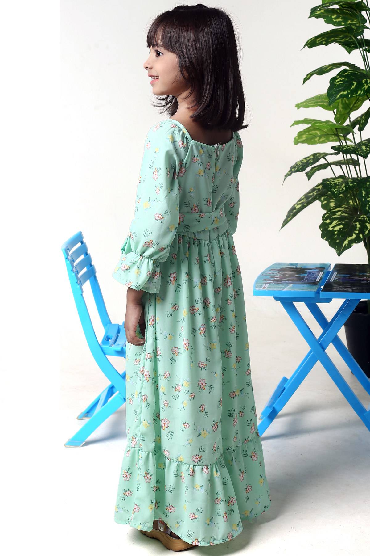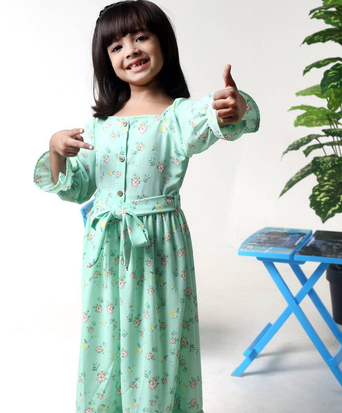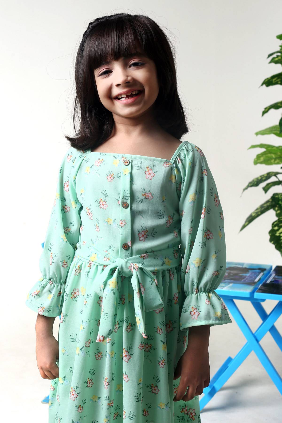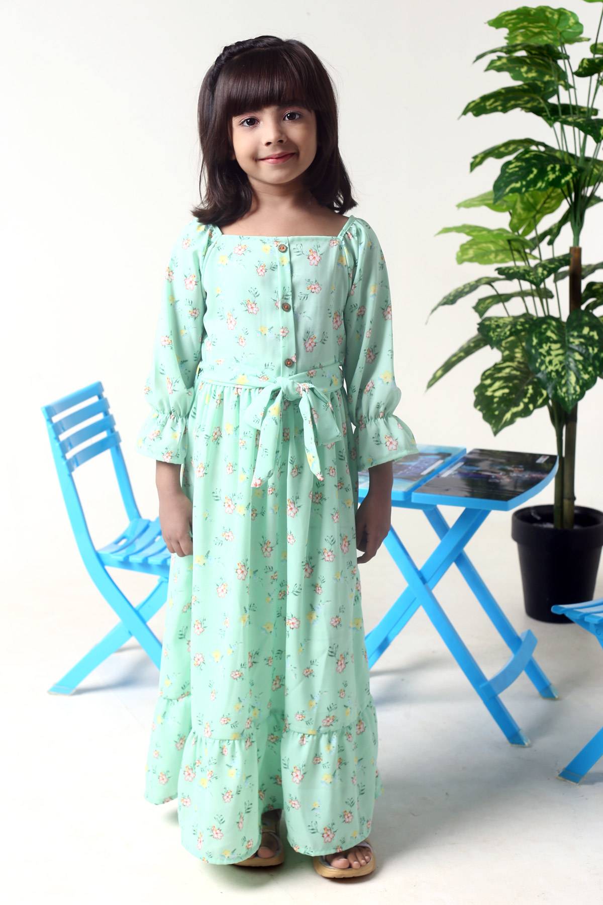 Crafted from premium Georgette fabric, this elegant dress offers a soft and breathable feel. The delicate floral print adds a touch of charm, complemented by stylish wooden buttons for a classic look. A matching fabric belt cinches the waist beautifully, enhancing the silhouette while ensuring comfort. With ruffled cuffs and a graceful flow, this dress is perfect for casual outings, festive gatherings, or special occasions.