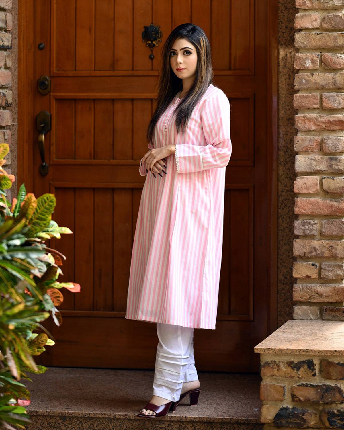Introducing the Chinar 2-piece set made from soft cotton fabric for casual wear. The shirt has fine stitching with lace on the sleeves, along with tassels and moti accents. The trousers feature a pintex style with lace detailing, making this outfit perfect for relaxed outings while maintaining a stylish look.