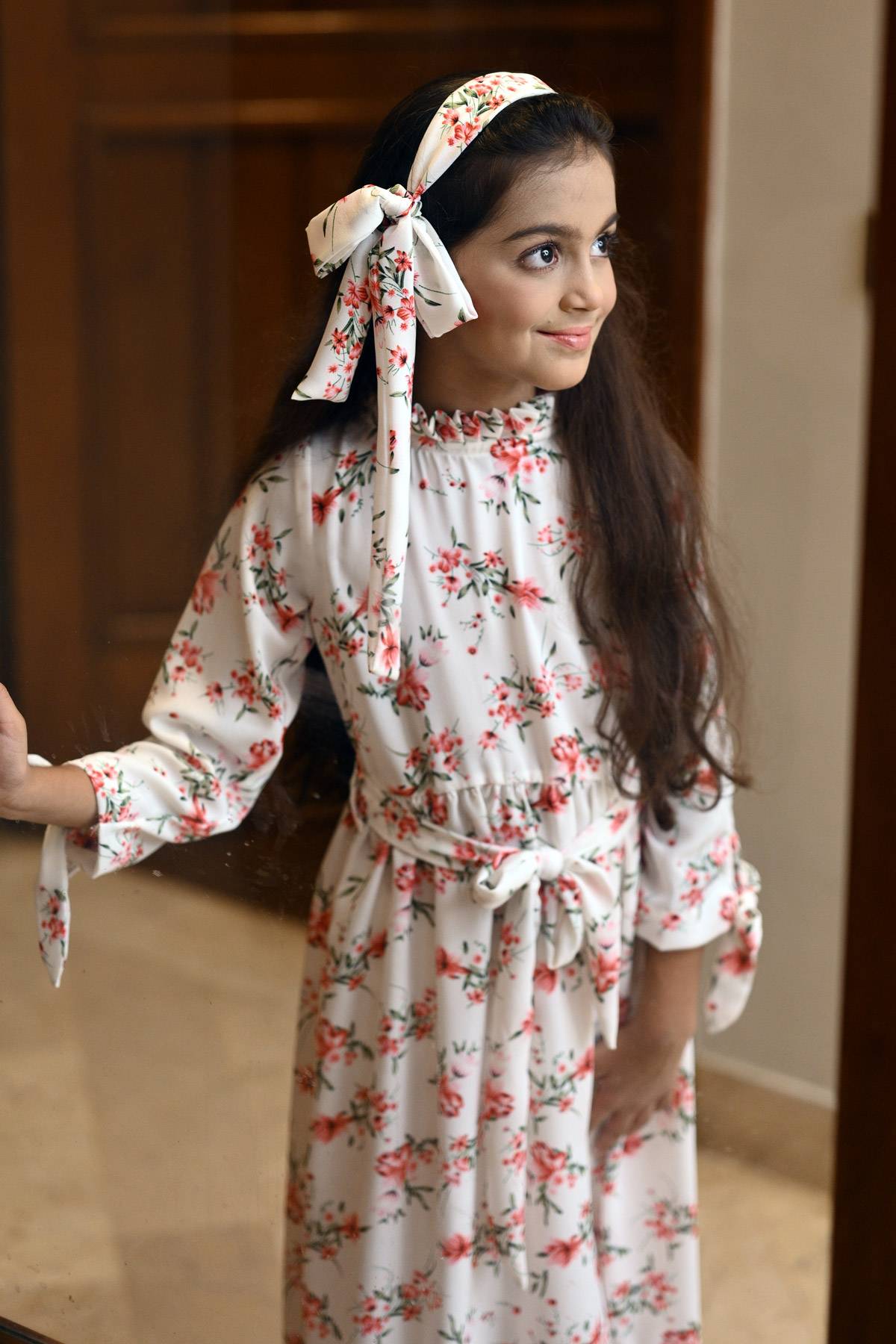 Crafted from premium Georgette fabric, this elegant dress offers a soft and breathable feel. The delicate floral print adds a touch of charm, complemented by stylish wooden buttons for a classic look. A matching fabric belt cinches the waist beautifully, enhancing the silhouette while ensuring comfort. With ruffled cuffs and a graceful flow, this dress is perfect for casual outings, festive gatherings, or special occasions.
