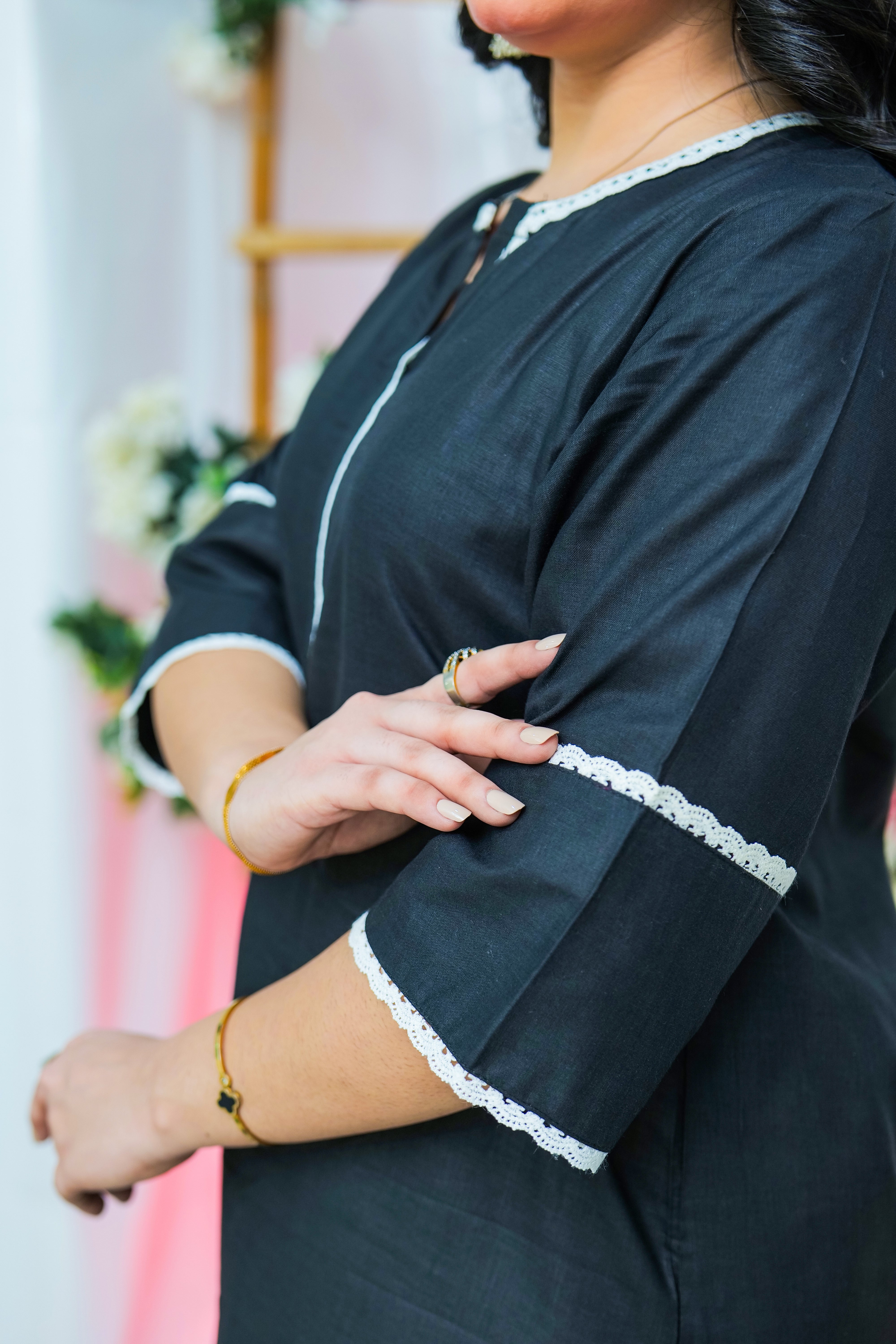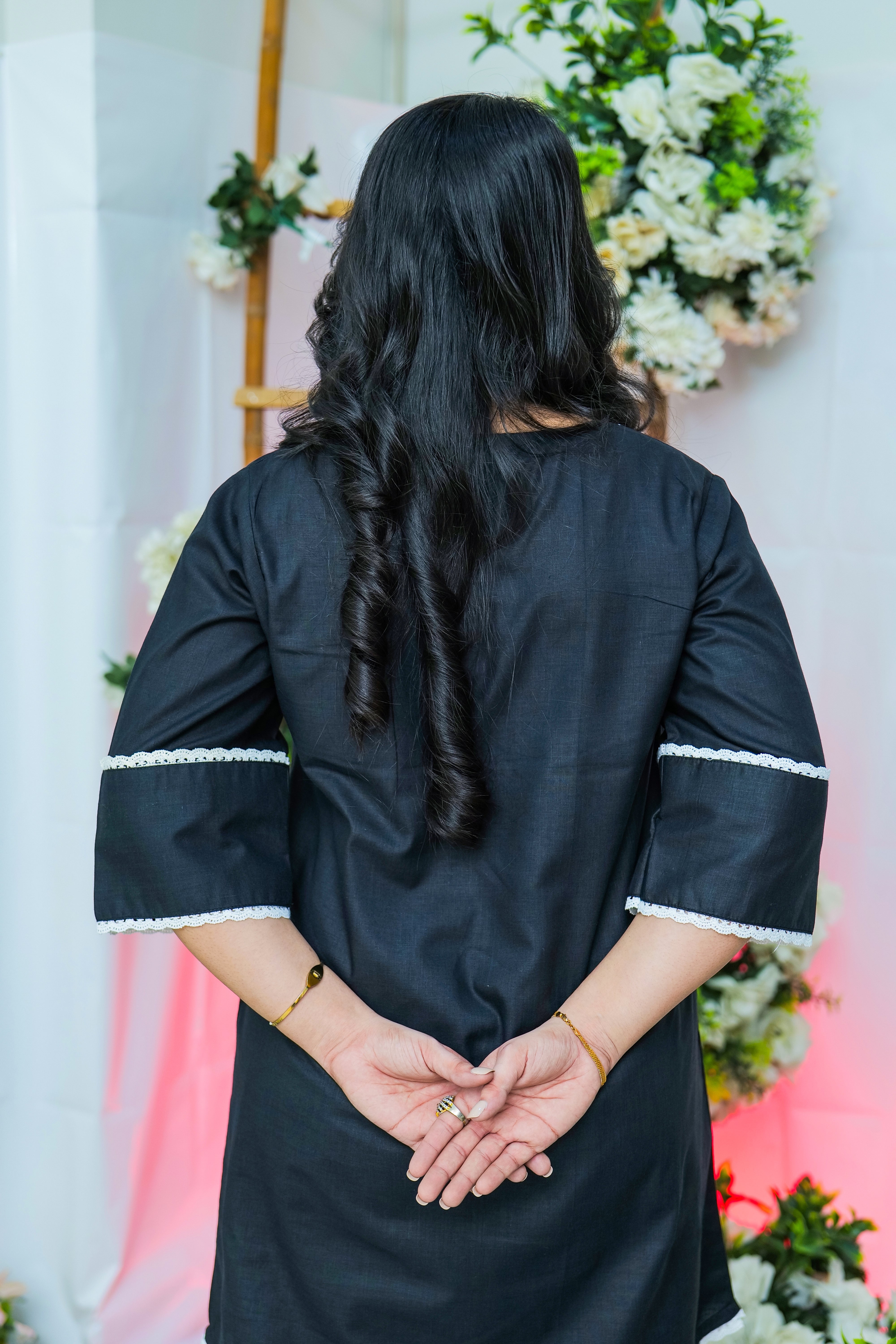 Tailored to perfection, the set features a flowy kurti with fine accents along the neckline and sleeves, paired with comfortable straight trousers. The clean lines and relaxed fit make it ideal for day-to-day wear without compromising on style. Whether you're heading to the office, running errands, or enjoying a casual lunch, Noir adds an effortless charm to your look.