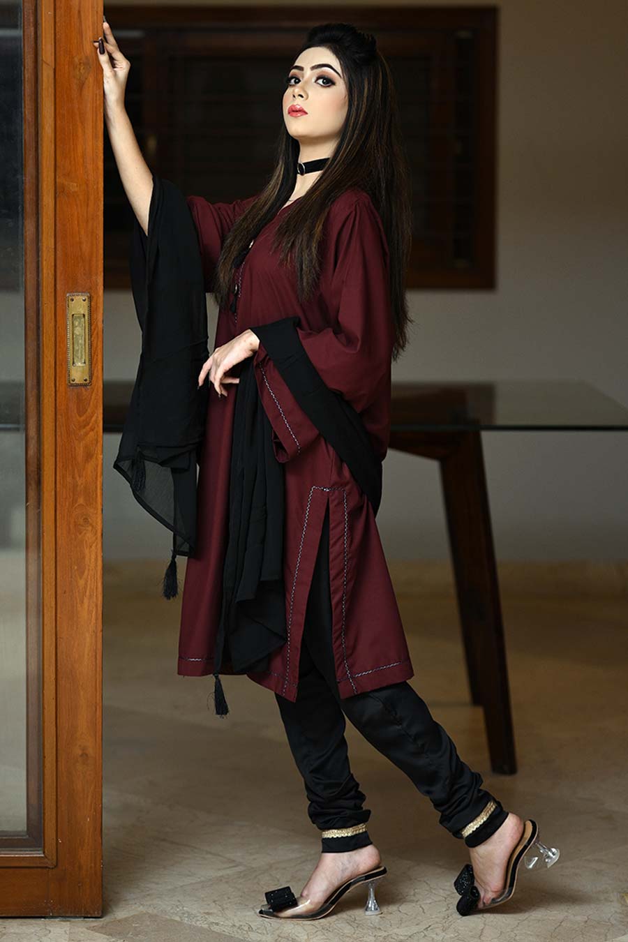 Introducing the Nigar 3-piece set, featuring a shirt made from soft modal with beautiful embroidery and a golden button with tassel accents. The churidar pyjamas include a golden lace detail at the bottom, and the shamoz silk dupatta is adorned with tassels. This ensemble is perfect for festive occasions, offering a stylish and refined look.