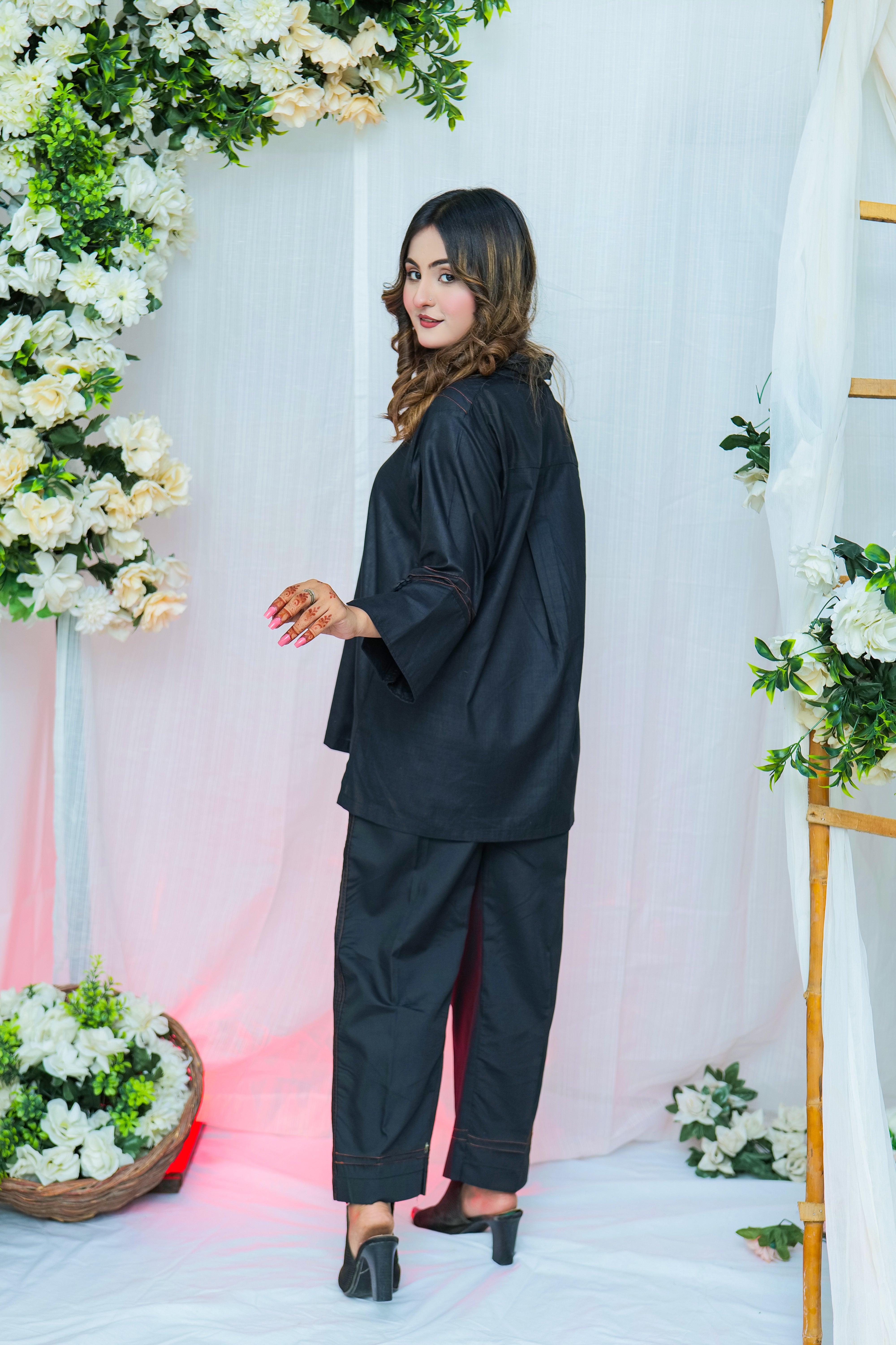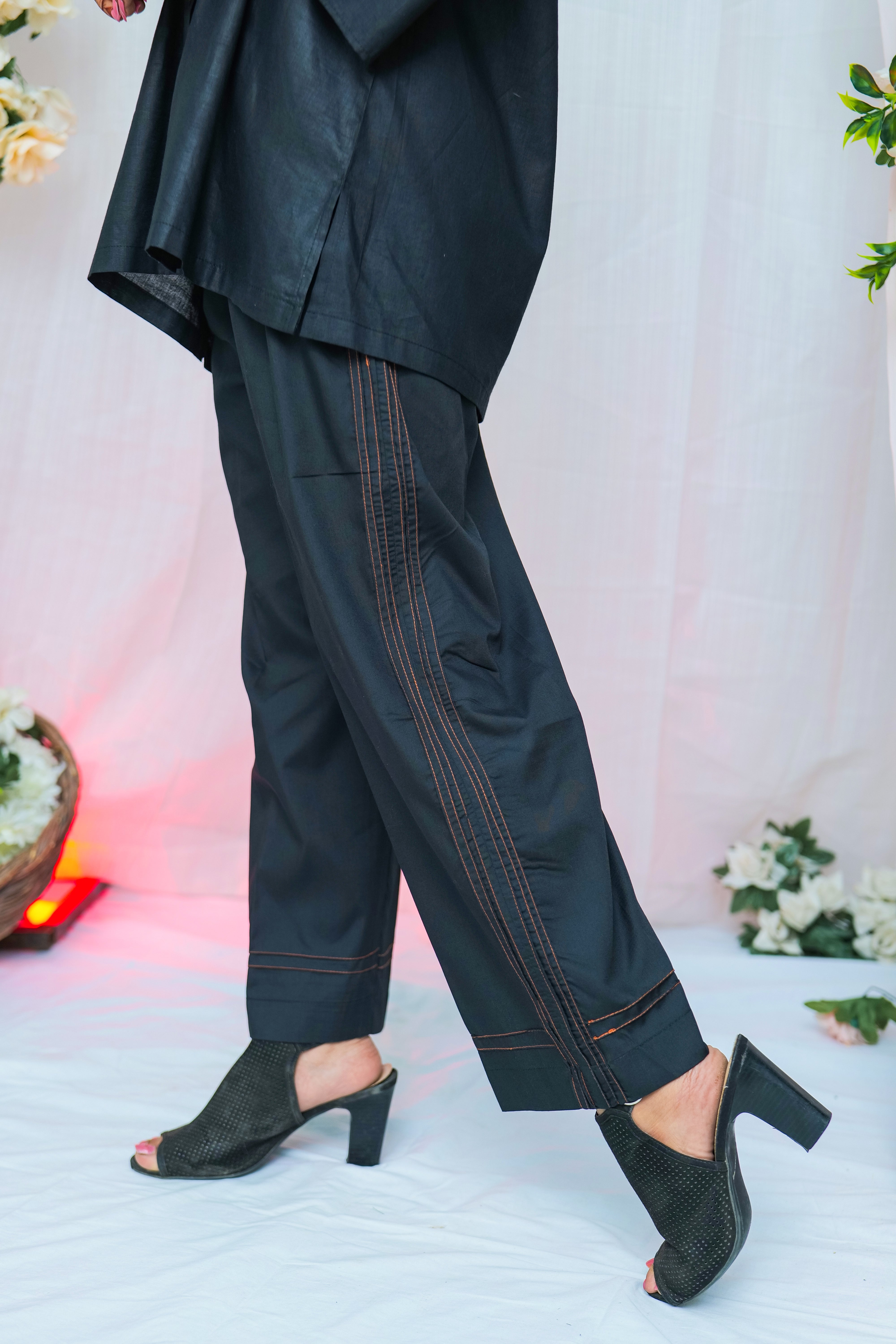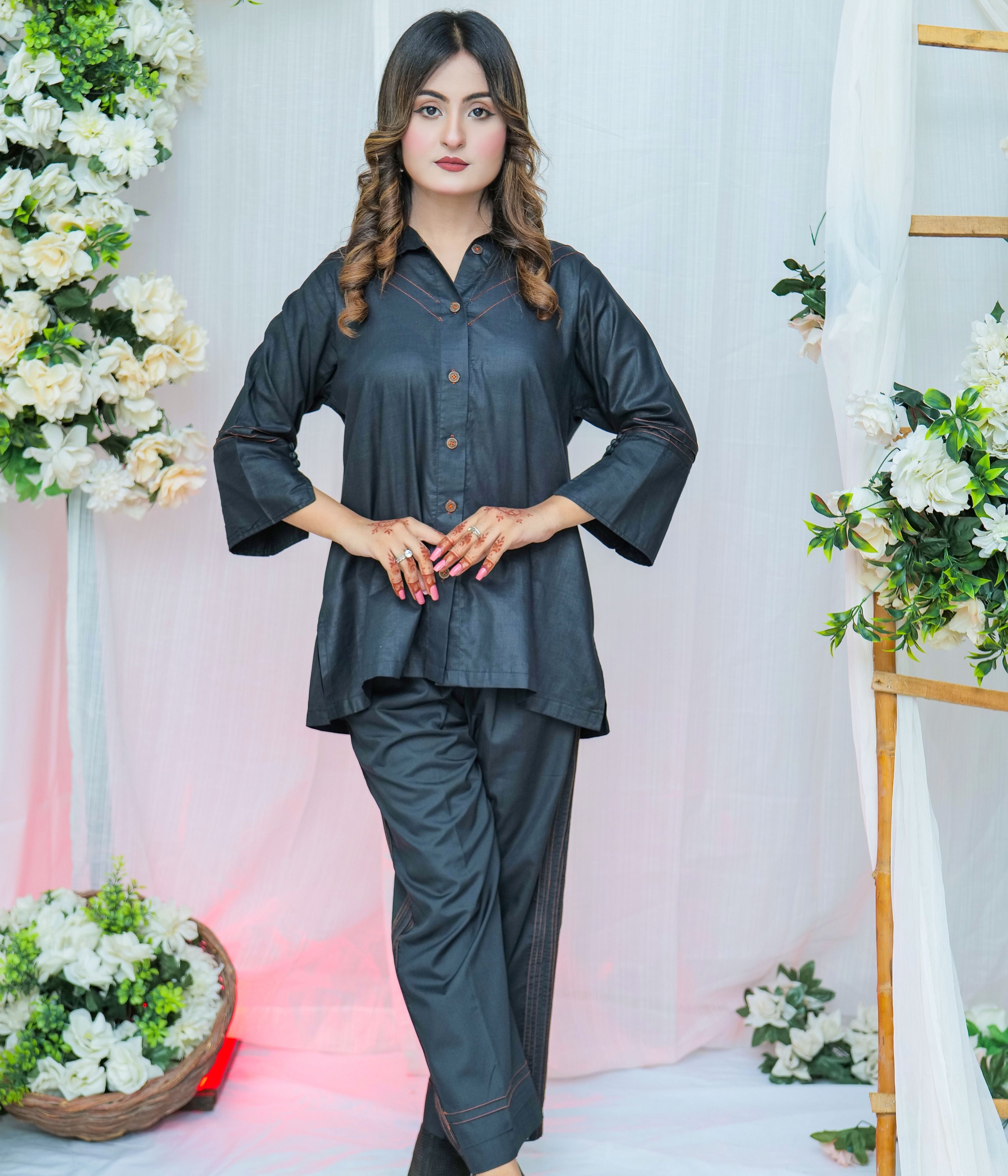 Crafted in jet black with subtle brown contrast stitching on the neckline, sleeves, and trouser hem, every detail is a nod to understated sophistication. The loose-fit button-down kurti offers breathable wear without compromising on shape, while the expertly tailored trousers ensure a smooth, flattering silhouette all day long.
