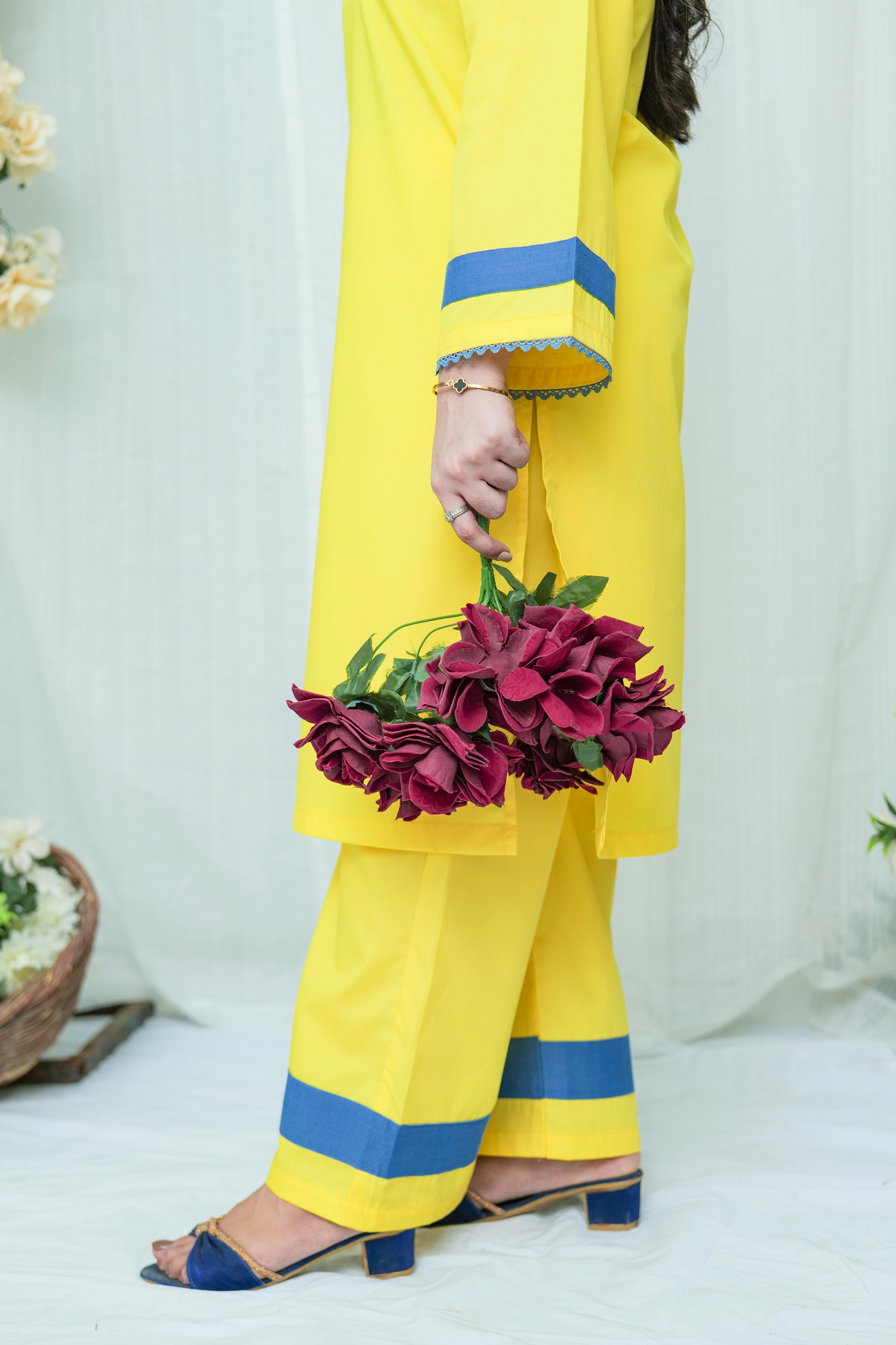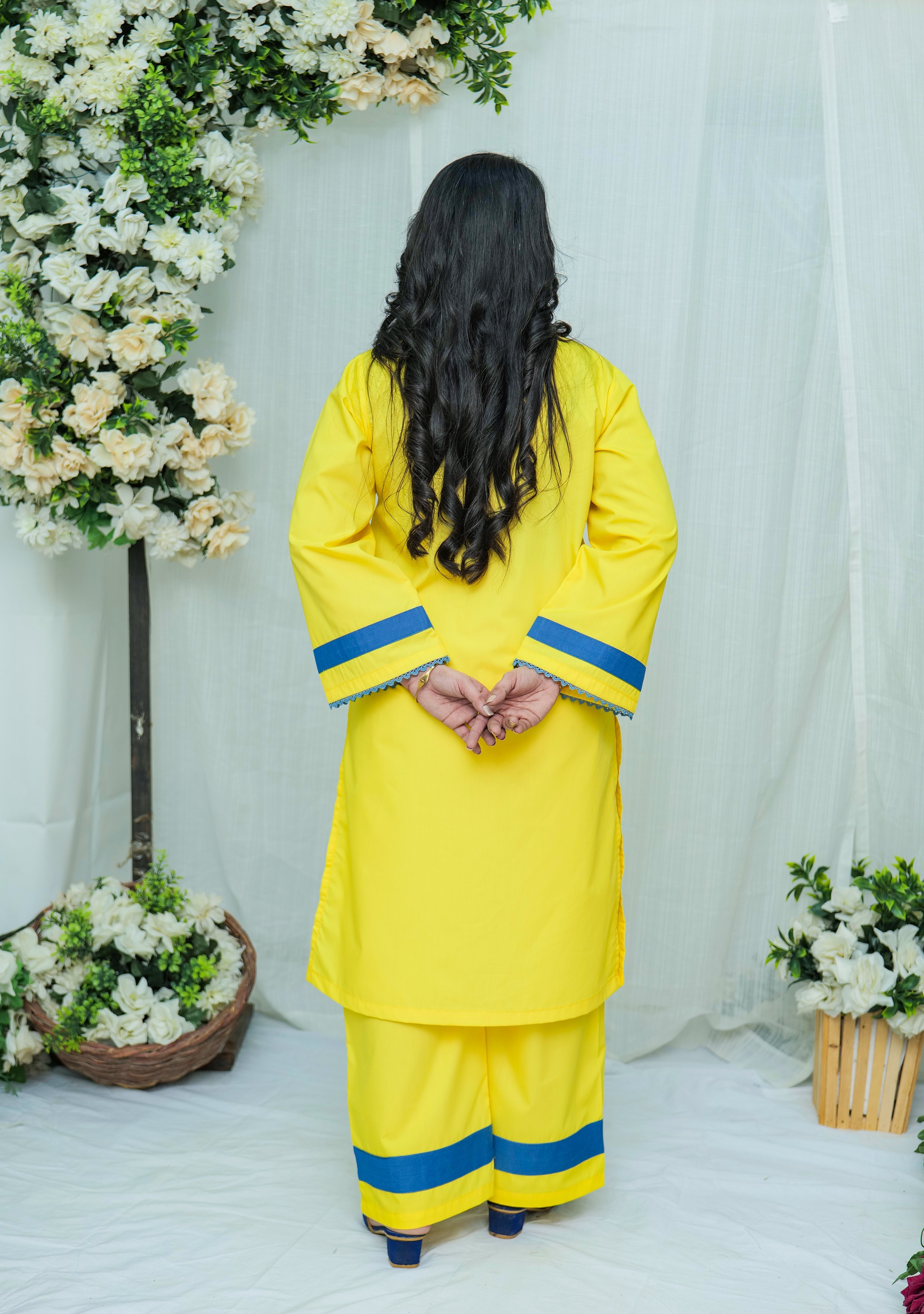 Radiant, cheerful, and beautifully balanced the Sunveil 2-Piece Set brings sunshine to your wardrobe with bold color play and crisp tailoring. Crafted in a bright yellow hue and accented with striking blue details, this modern Eastern outfit makes everyday dressing feel vibrant and fresh.