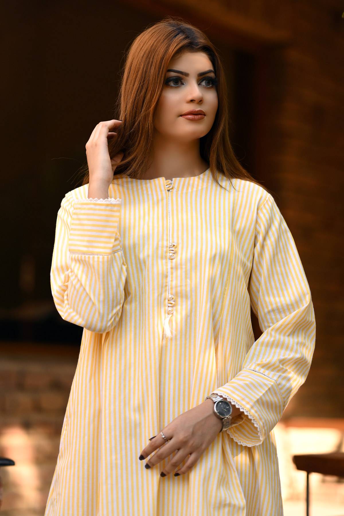 Presenting the Suraj Mukhi 2-piece set, created from soft cotton fabric for casual wear. The shirt includes fine stitching and lace on the sleeves, along with tassels and moti accents. The trousers are designed with a pintex style and lace details, making this outfit a great choice for laid-back occasions.