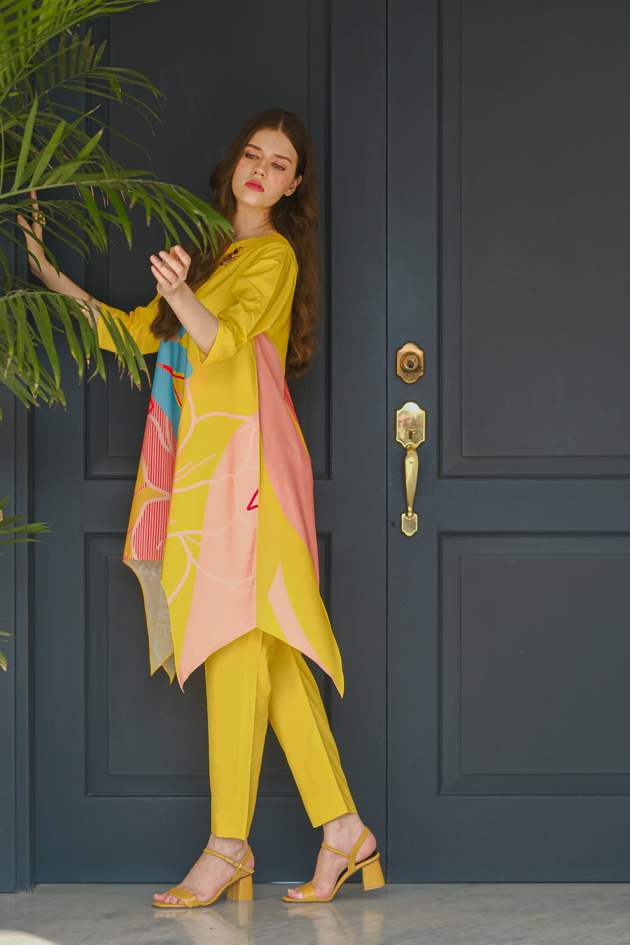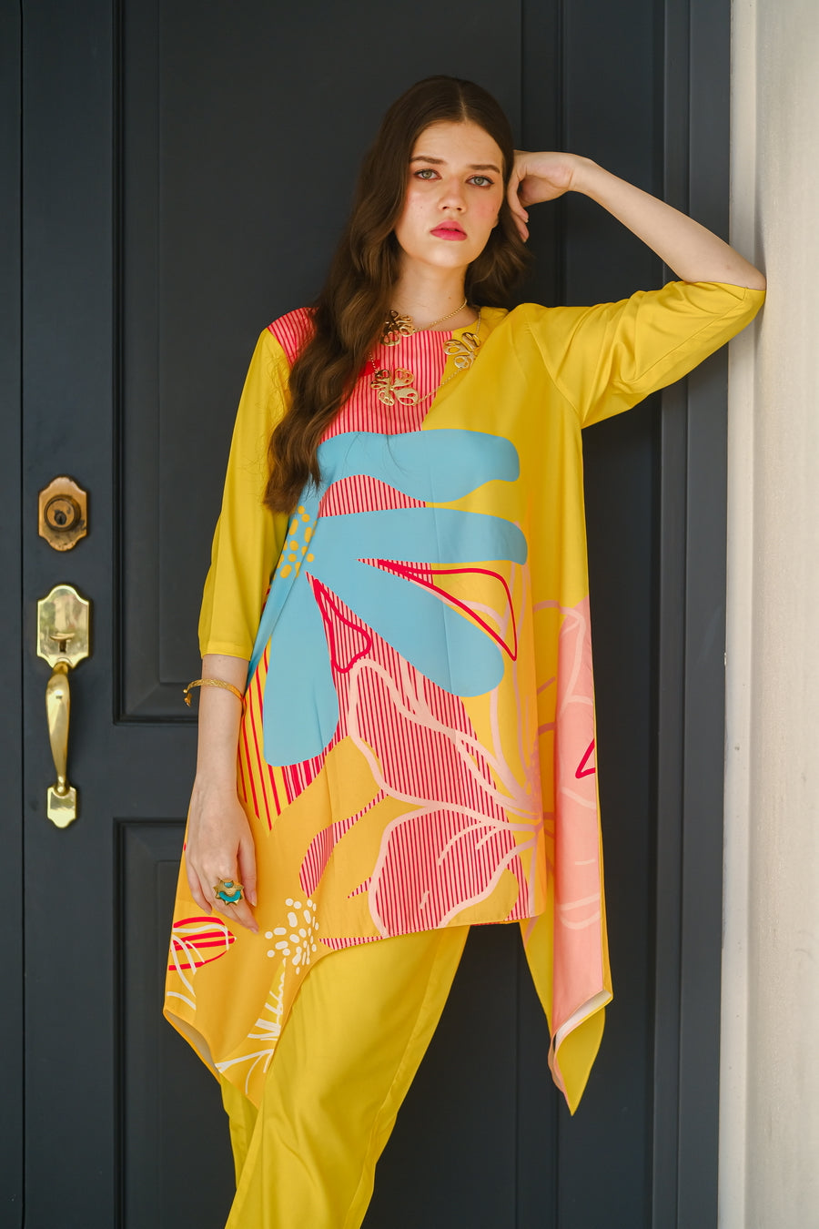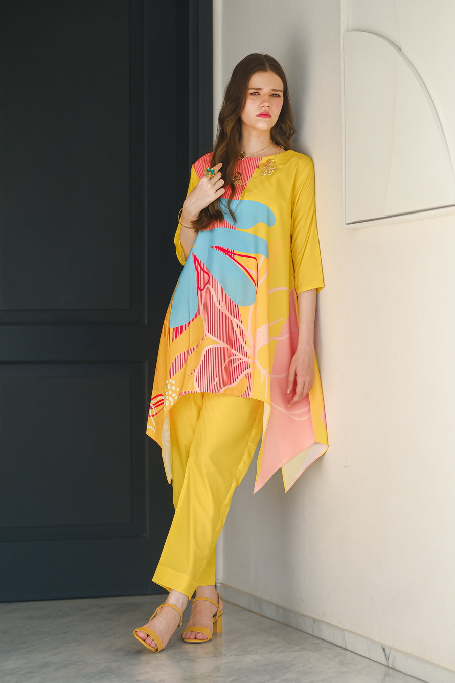 Introducing the ?Sundown? summer outfit, designed to brighten your wardrobe with its vibrant yellow crepe fabric. This eye-catching two-piece set features a chic short-sleeve shirt and matching trousers, highlighted by a bold, oversized flower graphic on the front. The lightweight, breathable crepe material ensures ultimate comfort and a flattering fit, perfect for warm-weather outings. Whether you're enjoying a sunny day at the beach or attending a lively summer event, the ?Sundown? ensemble combines playful elegance with effortless style. Make a statement this season with this radiant, floral-inspired outfit that celebrates the joy and warmth of summer.