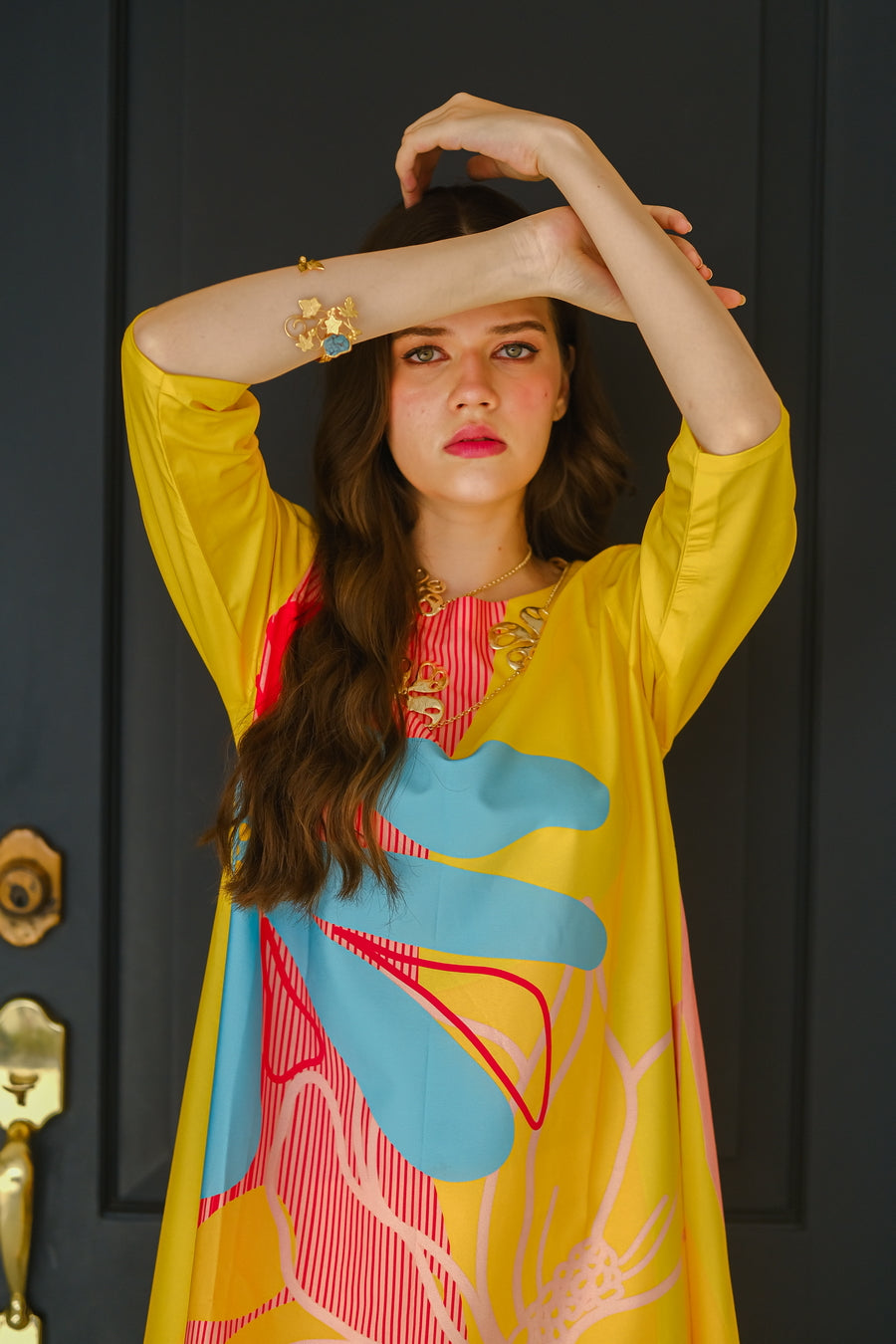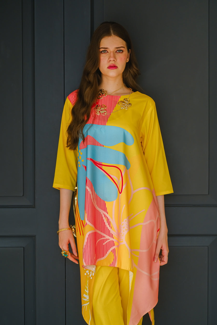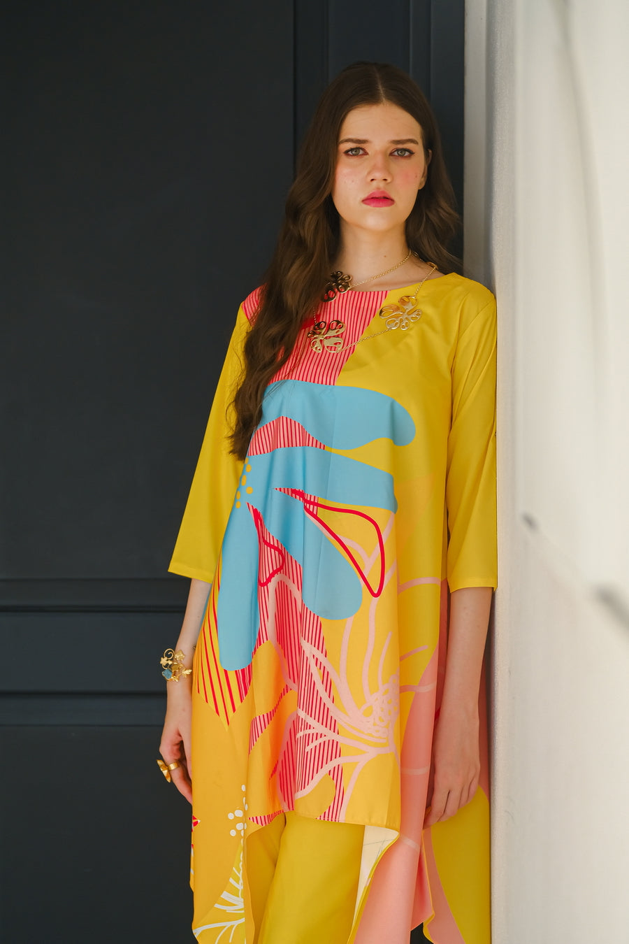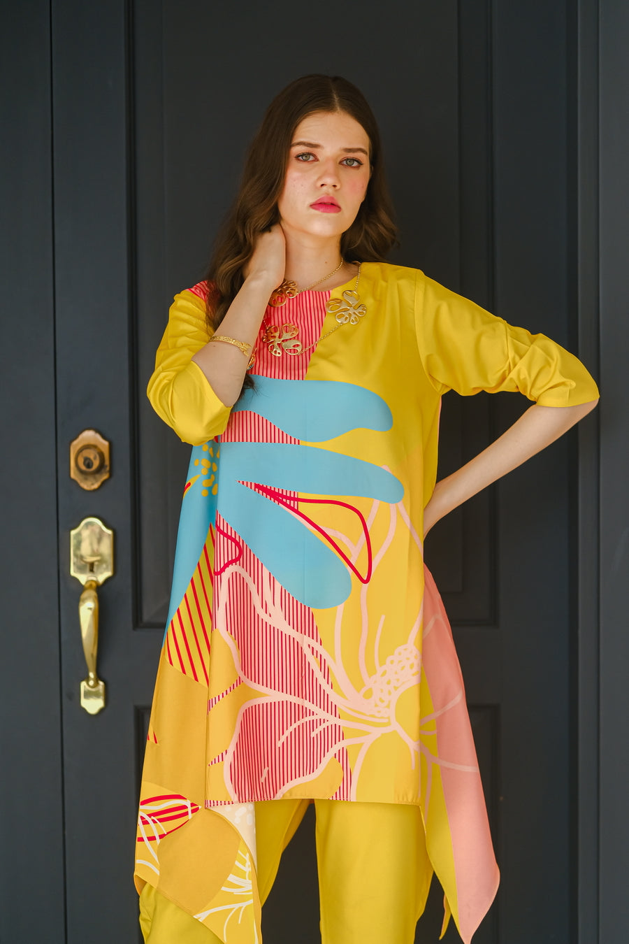 Introducing the ?Sundown? summer outfit, designed to brighten your wardrobe with its vibrant yellow crepe fabric. This eye-catching two-piece set features a chic short-sleeve shirt and matching trousers, highlighted by a bold, oversized flower graphic on the front. The lightweight, breathable crepe material ensures ultimate comfort and a flattering fit, perfect for warm-weather outings. Whether you're enjoying a sunny day at the beach or attending a lively summer event, the ?Sundown? ensemble combines playful elegance with effortless style. Make a statement this season with this radiant, floral-inspired outfit that celebrates the joy and warmth of summer.