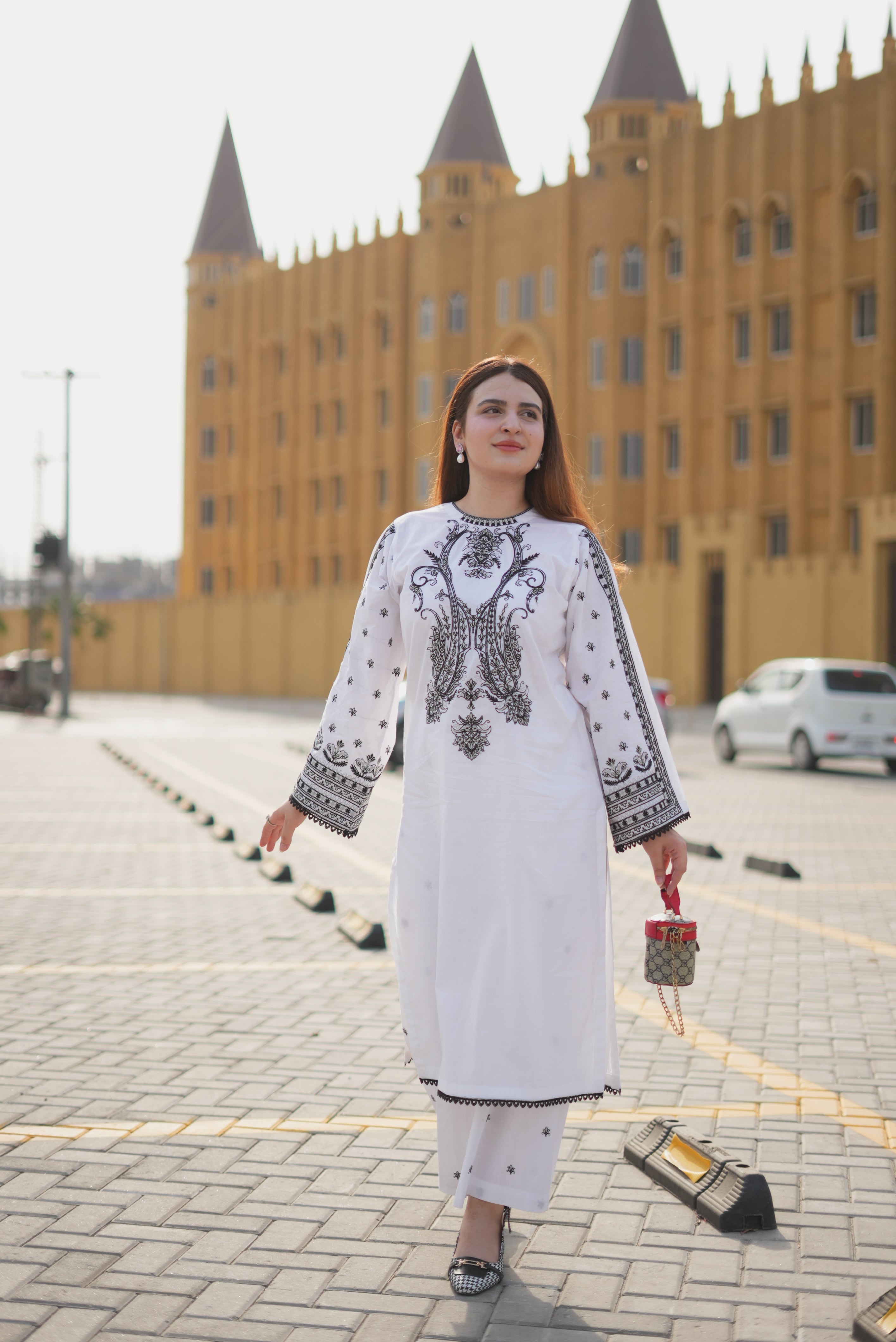 Radiate elegance in this timeless white ensemble, thoughtfully designed with intricate detailing. The shirt features a beautifully embroidered neckline that draws the eye, while the full-length sleeves are richly adorned with embroidery for a regal touch. Completing the look, the trousers are styled with delicate boti embroidery, bringing subtle charm and cohesion to the outfit. A perfect pick for daytime festivities and elegant summer gatherings.