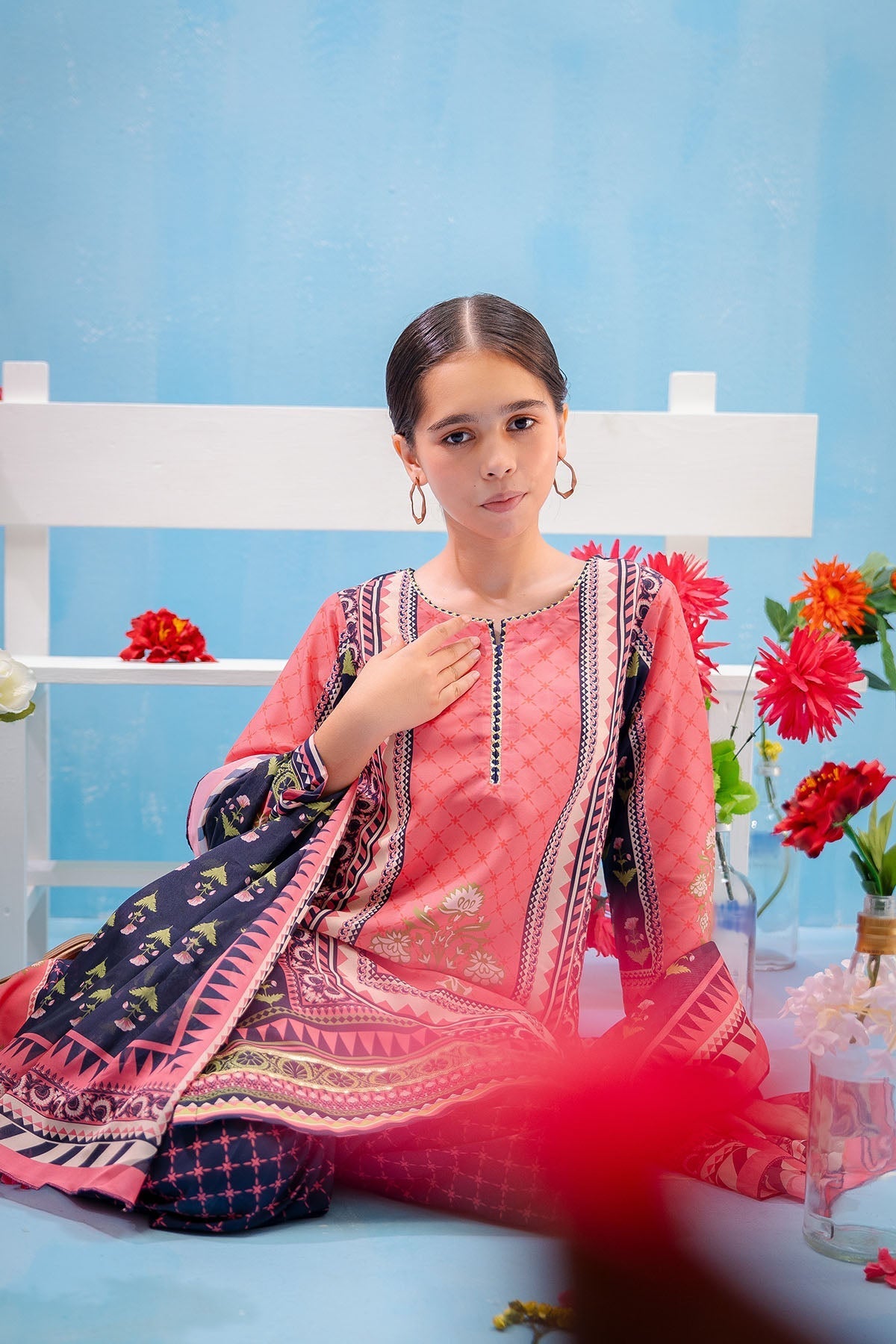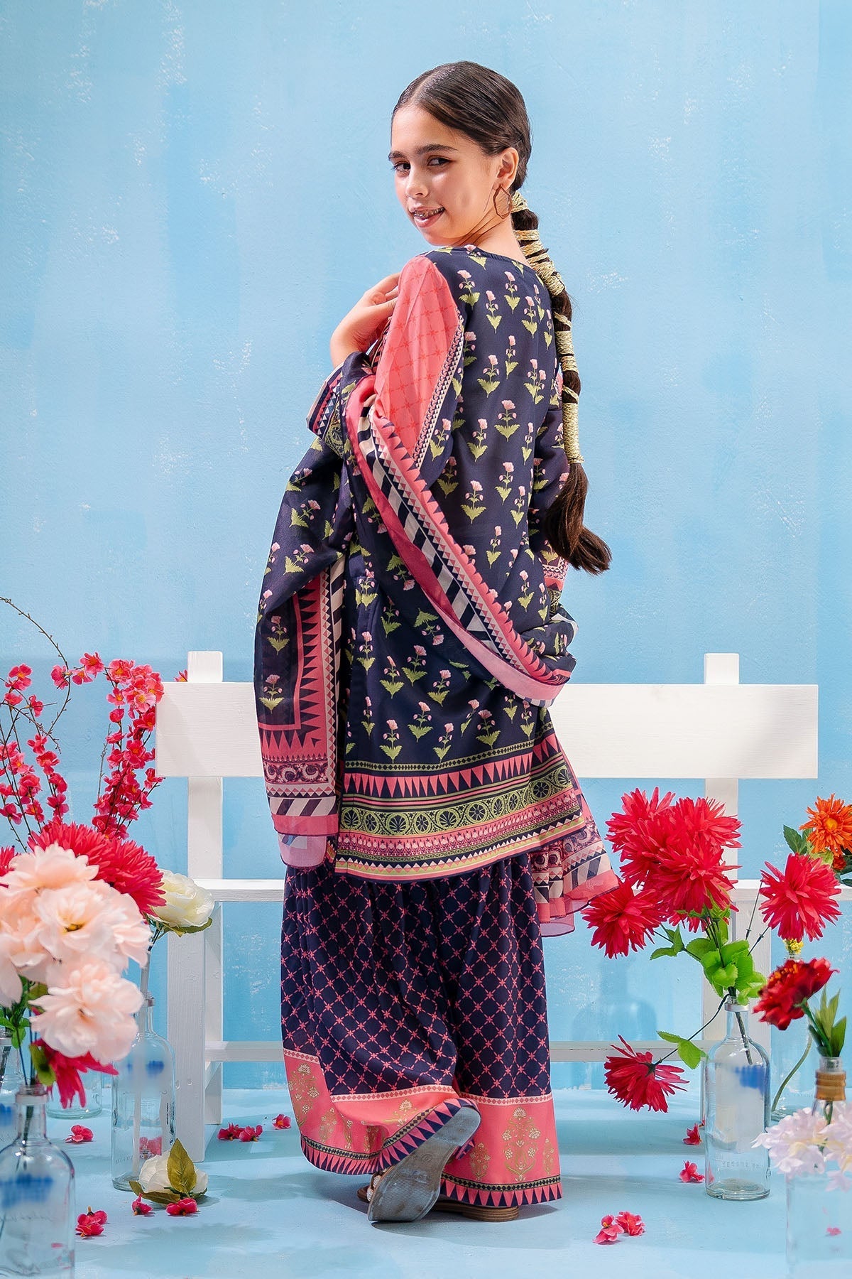 Top: Pink Swiss Lawn Digital Printed KurtaBottom: Navy Blue Swiss Lawn Digital Printed Gharara PantsDupatta: Navy Blue and Pink Silk Digital Printed Dupatta