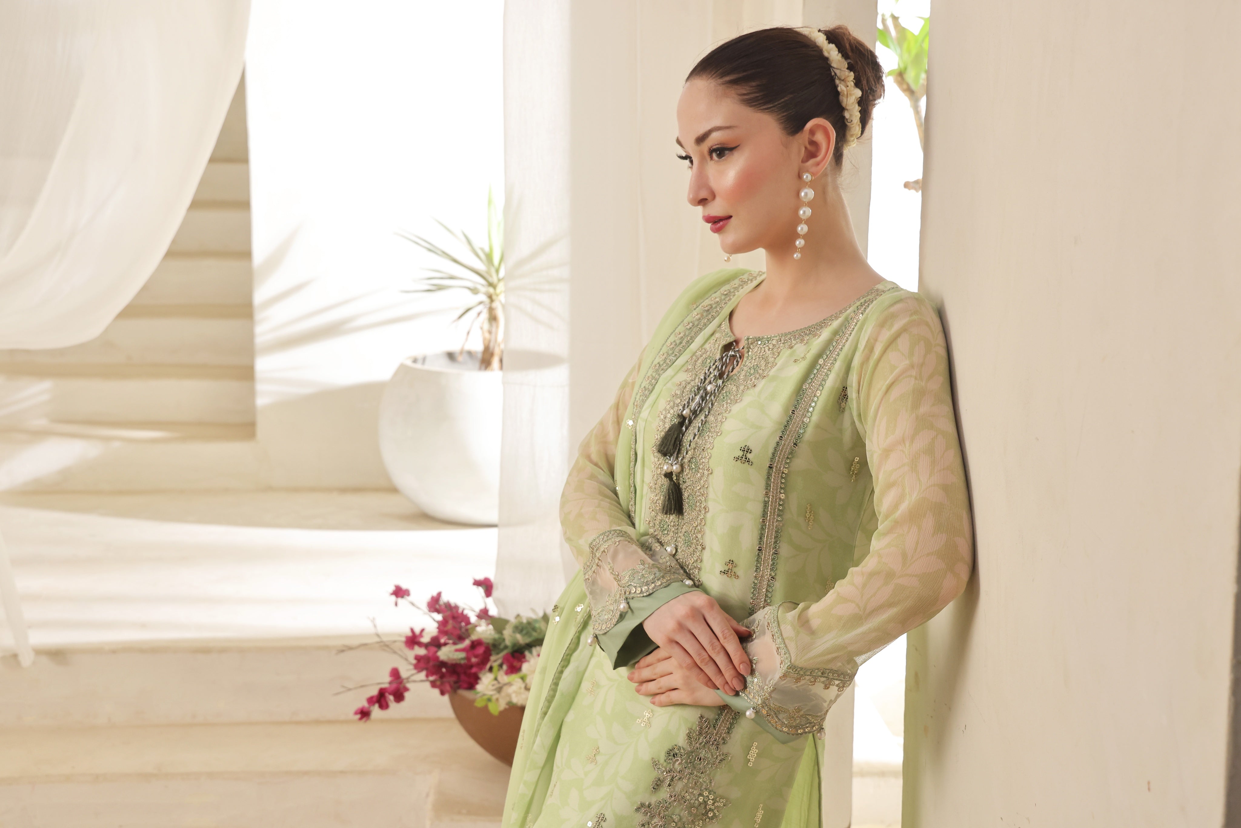 Dupatta: Ready-to-wear luxury embroidered chiffon dupatta, adding effortless grace to the ensemble.