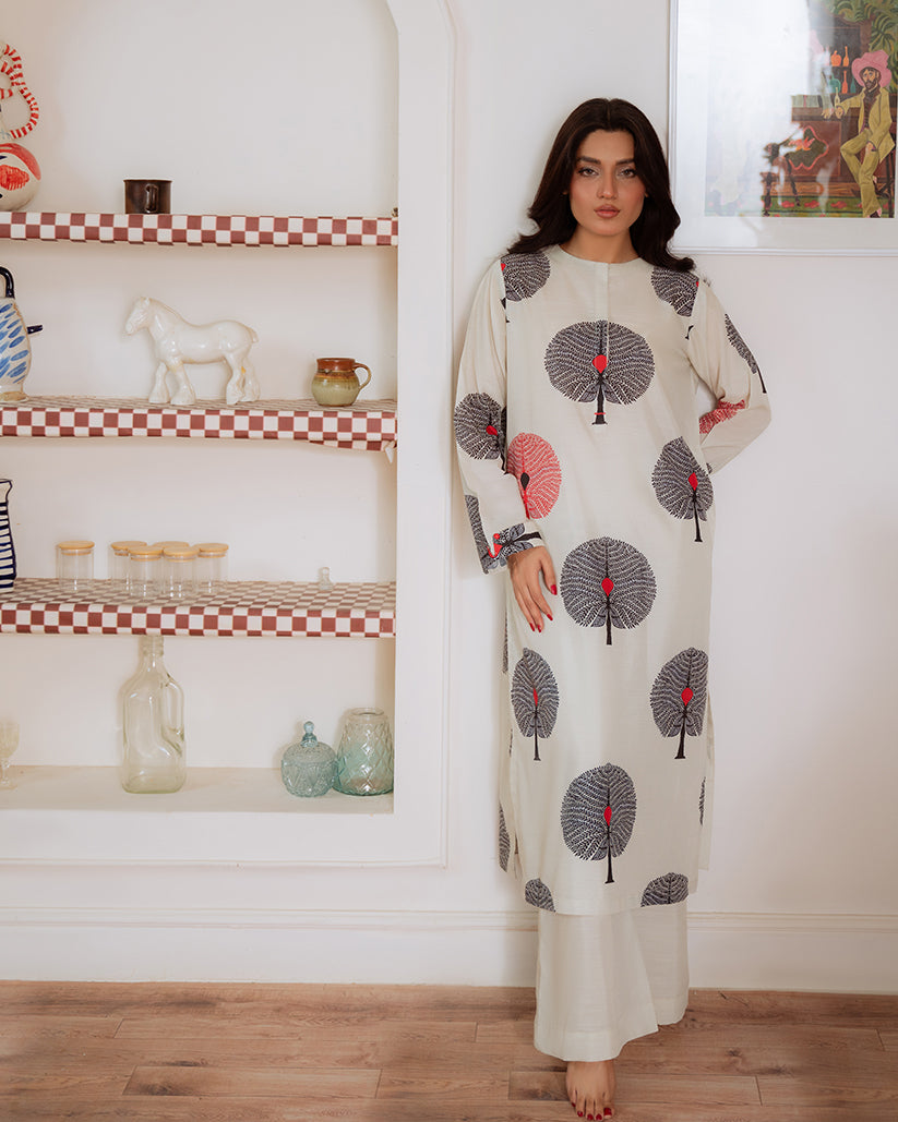 THIS OFF-WHITE CO-ORD SET FEATURES A LONG SHIRT AND STRAIGHT TROUSERS