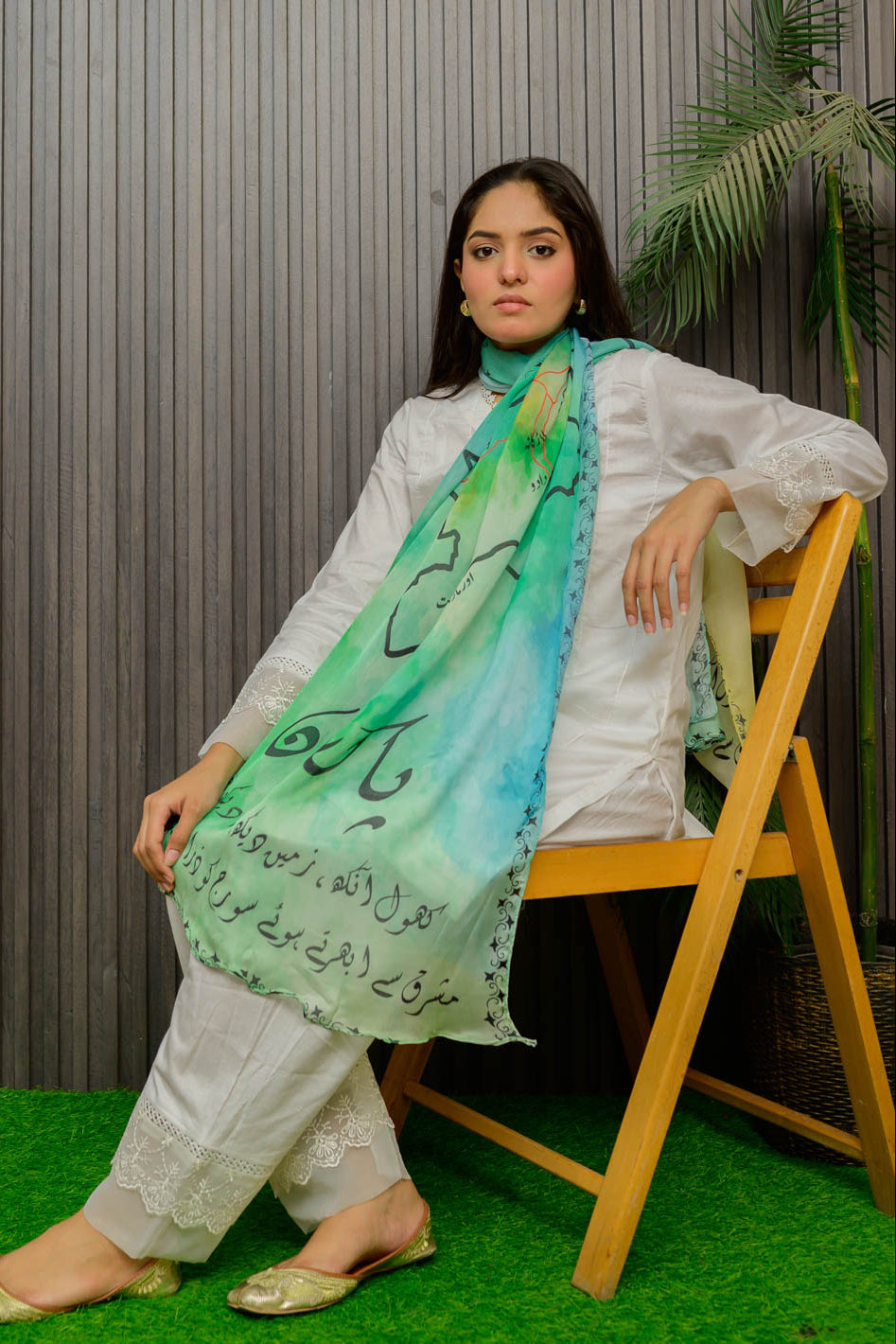 Here is Naqshah Stole which is representing Pakistan and giving you whole Pakistan on your palm. Designed with Pakistani map and four side beautiful designed border as well two side borders are filled with Allama Iqbal's beautiful poetry.