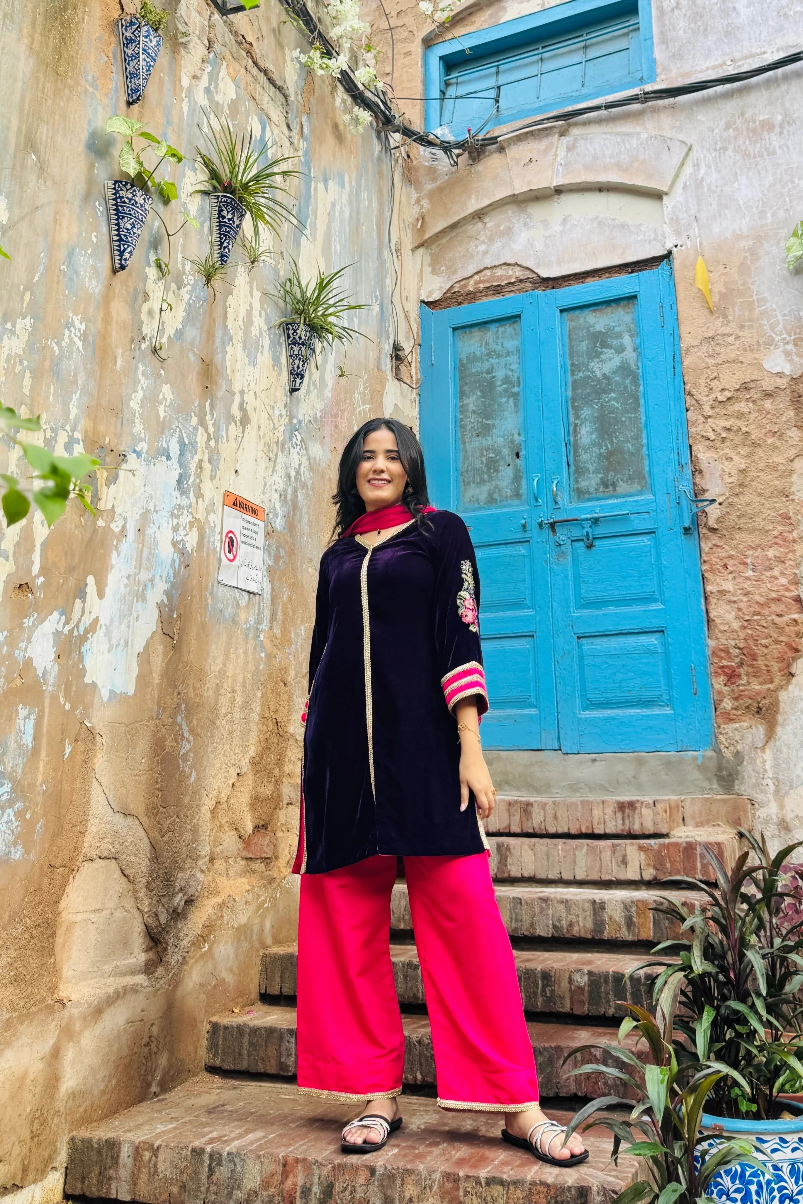 Description: A luxurious plum velvet kurta with gold piping and pink sleeve borders. Features a straight cut, full sleeves, and elegant detailing — perfect for festive or semi-formal occasions.
