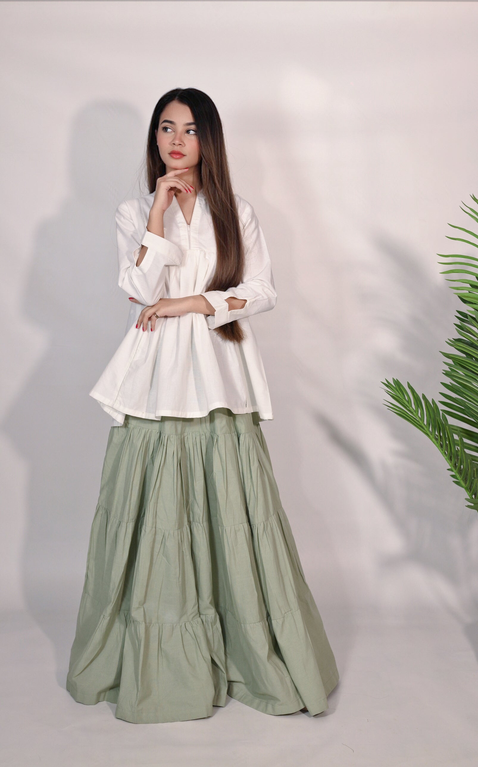 Elevate your everyday style with this sage green cotton maxi skirt, crafted from soft and breathable pure cotton fabric. Designed with a tiered silhouette and gentle gathers, it offers a flowy and elegant look that moves beautifully with every step.