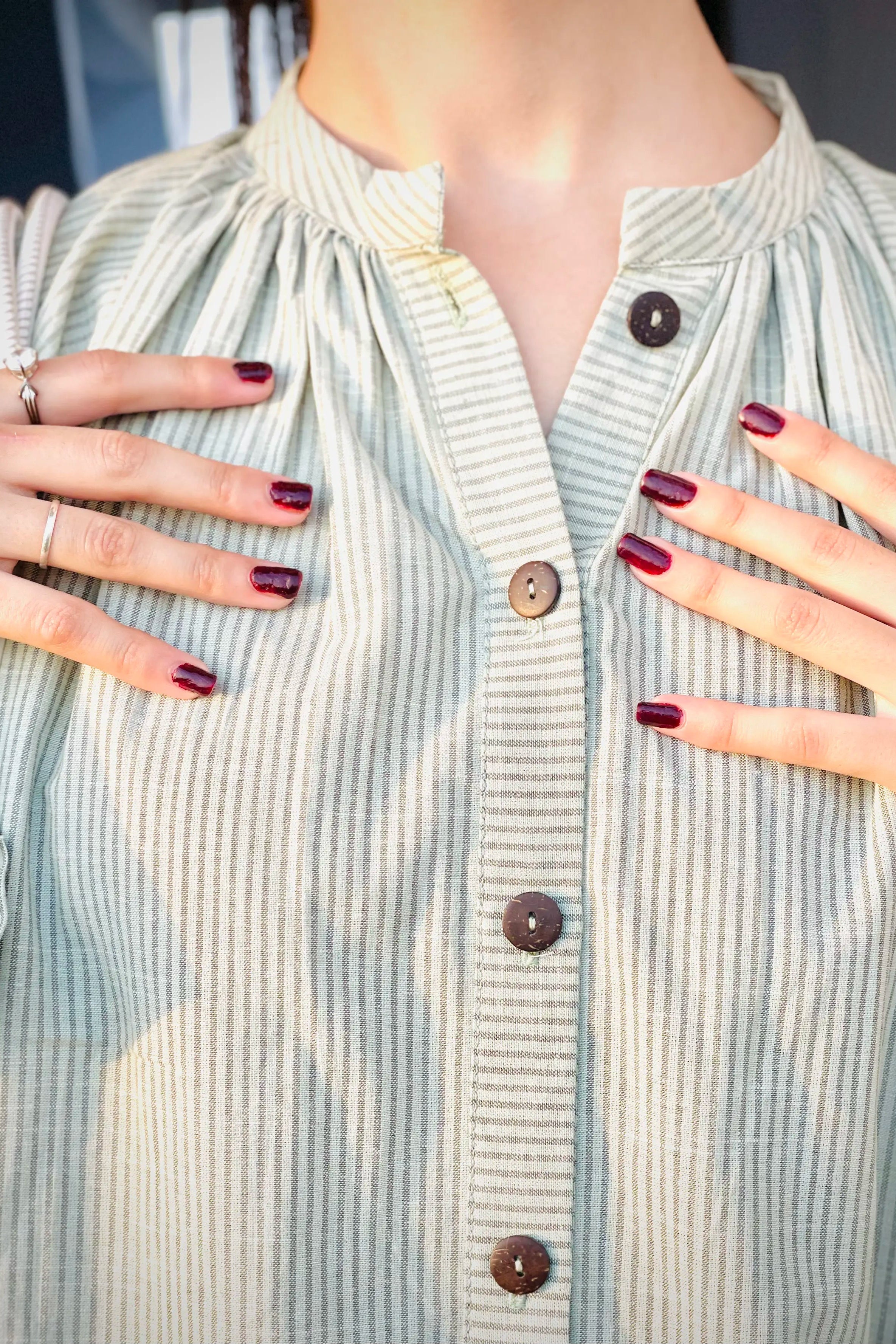 Crafted from premium yarn-dyed cotton, this outfit features subtle stripes that add a timeless charm. The top is detailed with handcrafted wooden buttons and soft gathers for a relaxed silhouette, while the matching trousers complete the look with understated sophistication.