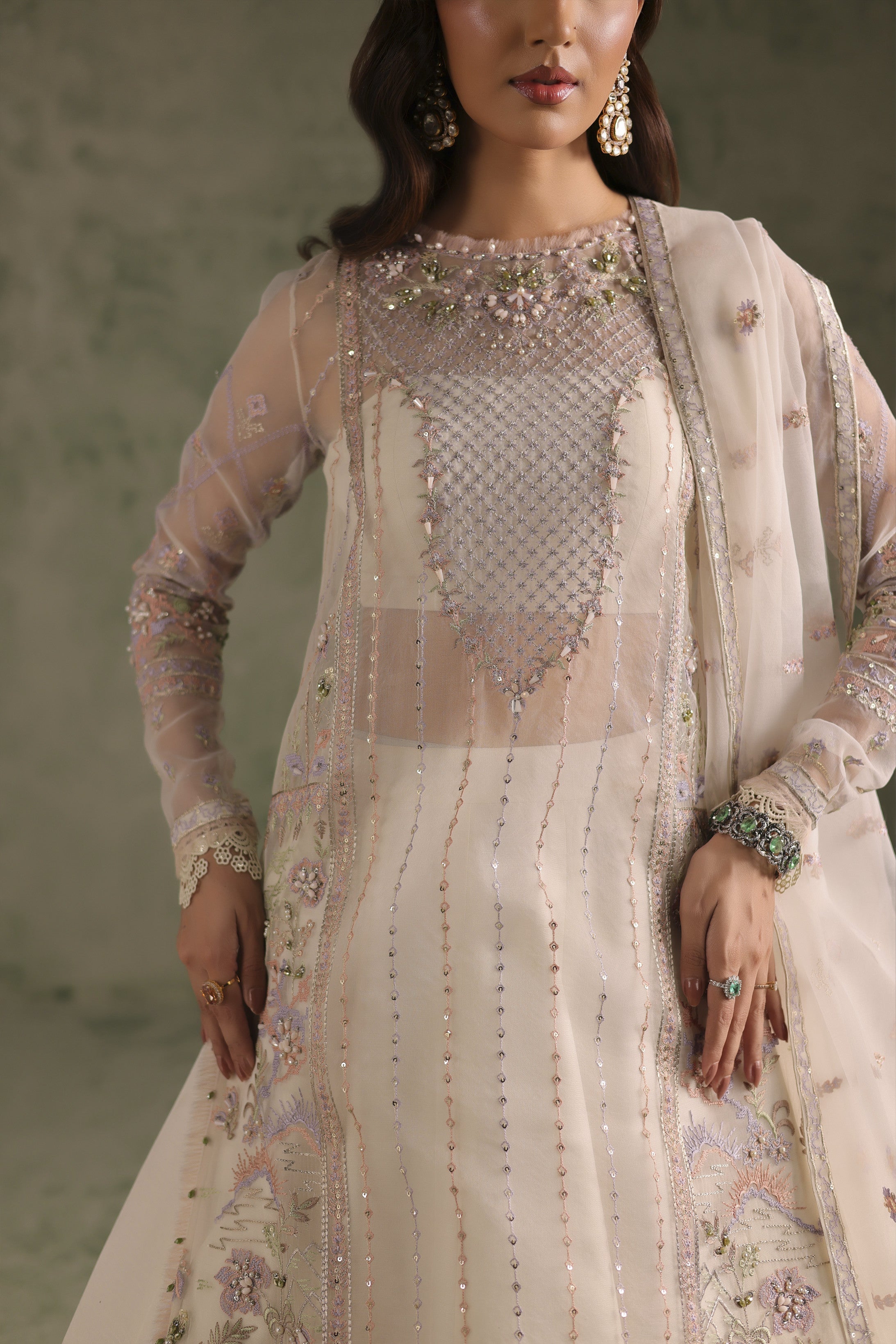 A masterpiece of craftsmanship, this ensemble is delicately composed on embroidered organza with intricate hand embellishments that transform fabric into art. The front center panel and side panels are richly adorned, brought to life with a symphony of embellishment techniques. Sparkling kulfi, drops, and bethki in different colors shimmer alongside Japanese cutdana, pearls, and kashti sitara, creating a radiant play of texture and light.