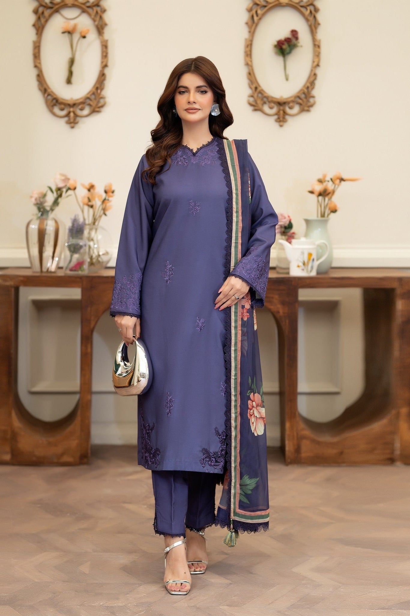 This outfit is a fresh deep purple set adorned with delicate tone-on-tone floral embroidery on the neckline, sleeves, and lower hem, adding a touch of elegance to its minimalist design. Made from a flowy fabric, it drapes gracefully, making it suitable for semi-formal occasions. Paired it with a floral printed dupatta, adding contrast and vibrancy to the overall ensemble.
