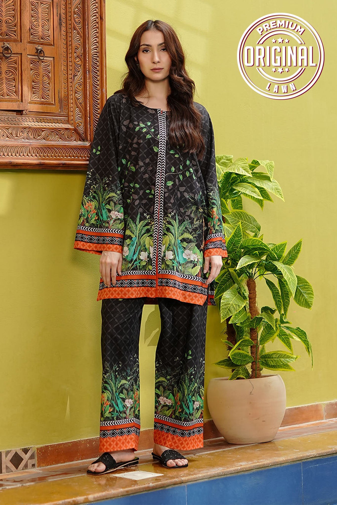 A bold ode to summer ease, this black co-ord set is elevated with a vibrant tropical print that brings movement and life to the fabric. Lush green foliage and delicate florals unfold along the hem and sleeves, creating a fresh contrast against the dark base. The look is finished with graphic monochrome accents and a striking orange border that adds warmth and energy. Paired with relaxed, straight-cut trousers, this ensemble blends comfort with statement design—ideal for sunny days or slow summer evenings.