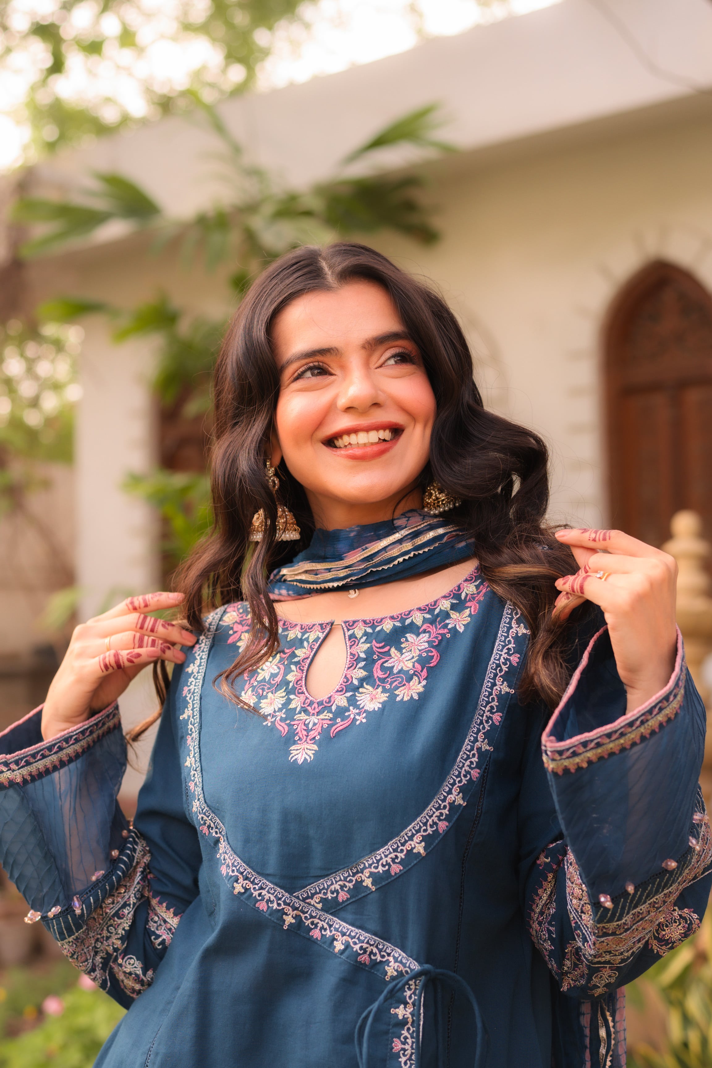 Warsha is a lawn 3-piece outfit in teal color. It features a paneled frock with beautiful floral embroidered keyhole neckline. The shirt features a rounded angrakha design which is highlighted by intricate embroidered borders and angrakha is adorned with handmade two toned dori tassel. The frock panels feature delicate joint lace while embroidered borders dazzle the hem of the frock. Sleeves of this outfit are a showstopper featuring heavy embroidery on a loose cut, giving the outfit a whimsy feel, while the hem of the sleeves features pleated organza insert dazzled with embroidered border at the bottom and crystal tassels on top. Frock is paired with matching wide leg bottoms in lawn. Dupatta is tie-dyed two toned chiffon featuring a creative pattern, finished with gota lace details on all four sides.